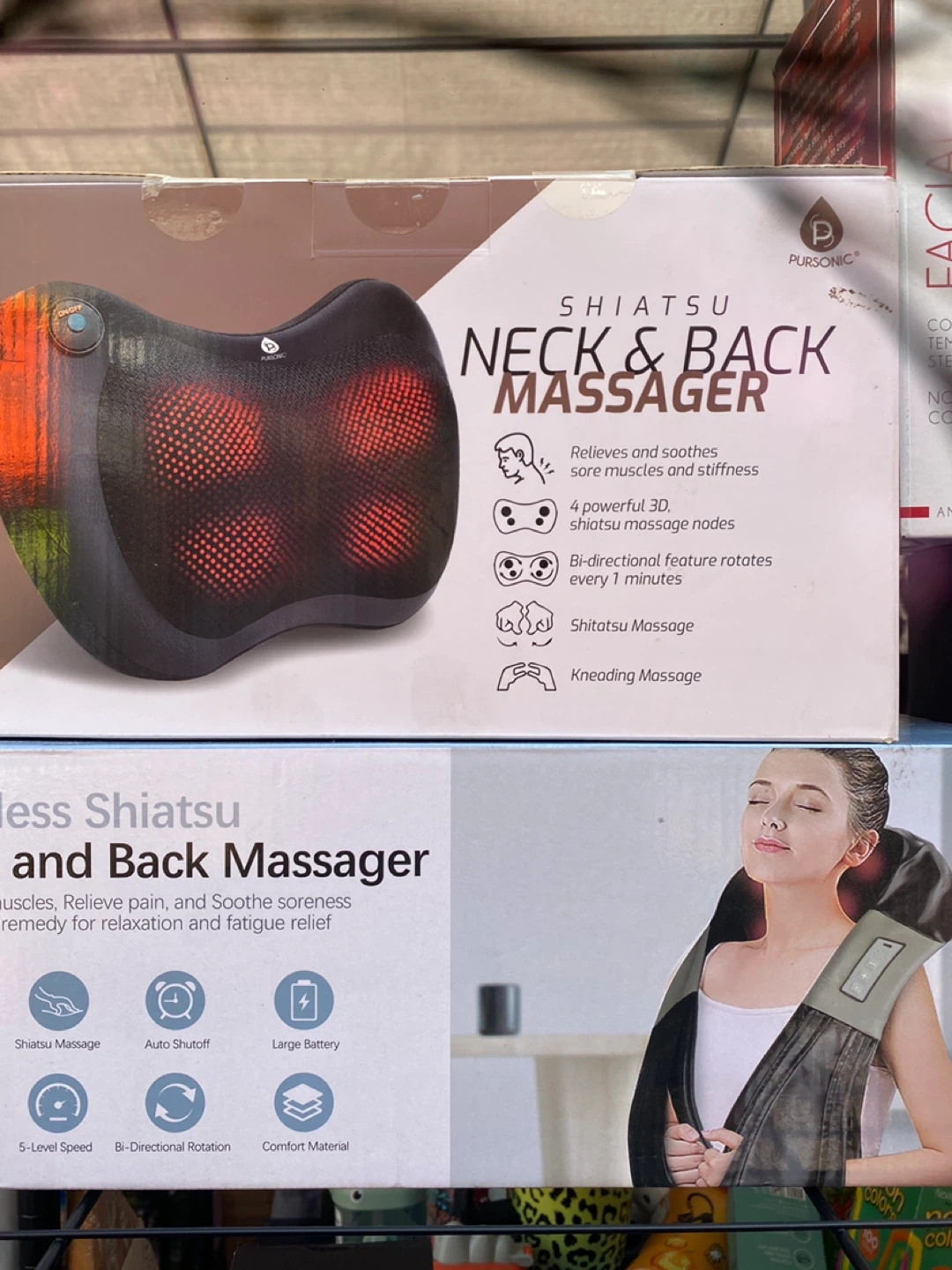 65I'm selling a Pursonic Shiatsu Neck & Back Massager! It relieves and soothes sore muscles and stiffness. It features 4 powerful 3D shiatsu massage nodes with a bi-directional feature that rotates every 1 minute. It also has auto shutoff and a large battery. It's perfect for relaxation and fatigue relief