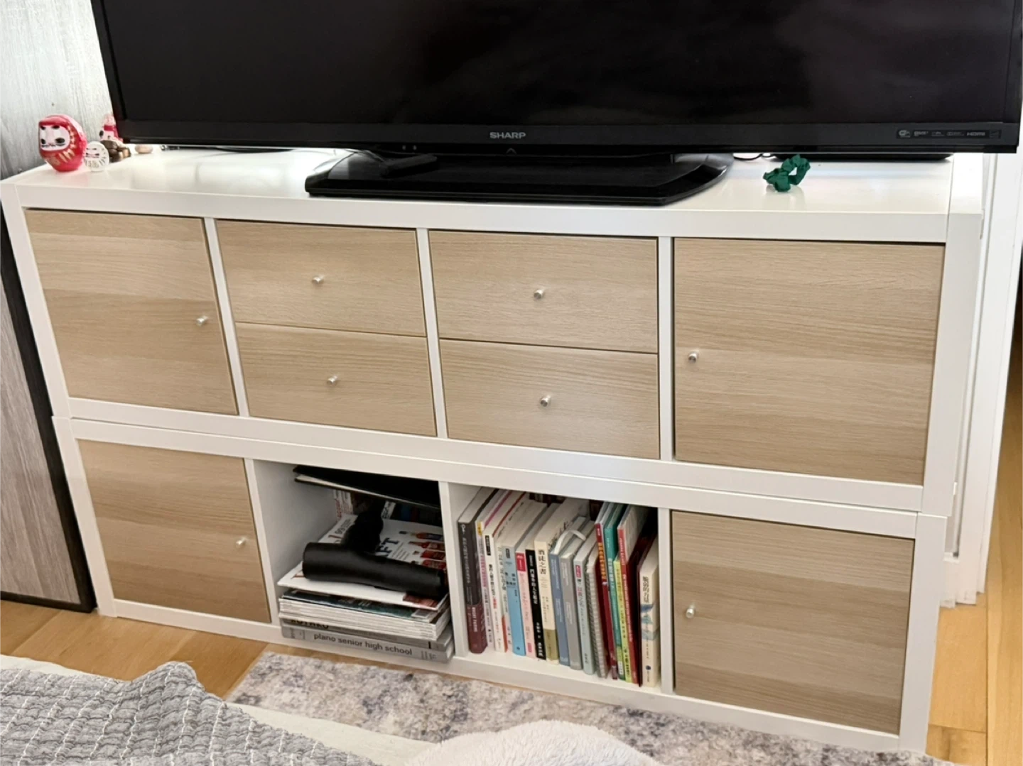 Selling two sets of IKEA Kallax shelf unit. It's in great shape and ready for a new home! This unit comes with a mix of open shelving, drawers, and doors, making it super versatile for storage and display. Perfect for organizing books, toys, or anything you need to keep tidy.