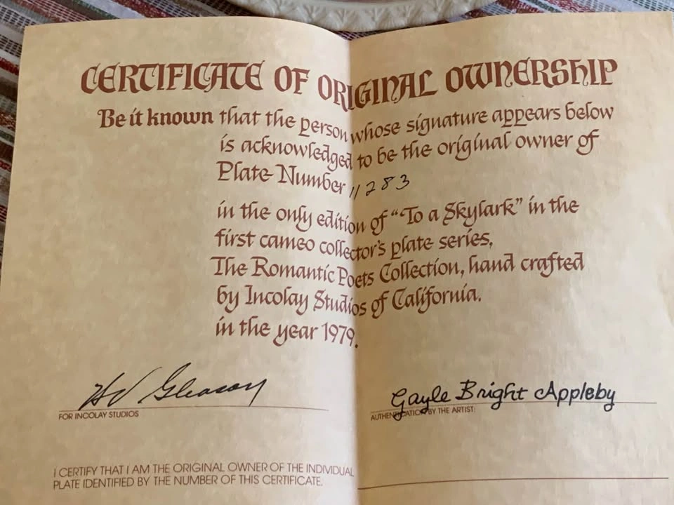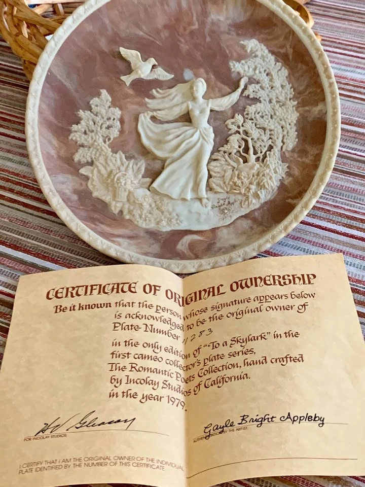 “To A Skylark” vintage collectible 10” plate from Incolay Studios of California. Sculptured by Gayle Bright Appleby. Hand carved stone in 3D. Third in a series of limited edition plates, “The Romantic Poets”. Plate #11283. In good vintage condition circa 1979. Pick up in Lindenhurst, NY.