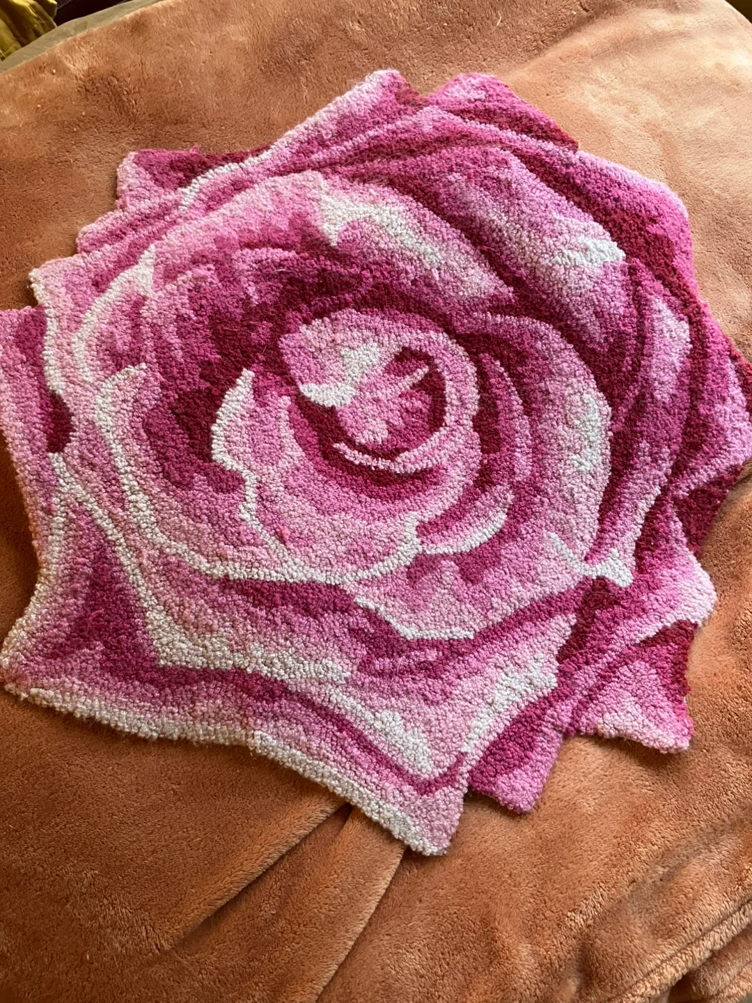 259This is a beautiful, unique rose-shaped rug! The colors are various shades of pink and white. It would be perfect for a bedroom or living room! Sells for 60 new, backing is not rubber but a canvas like material