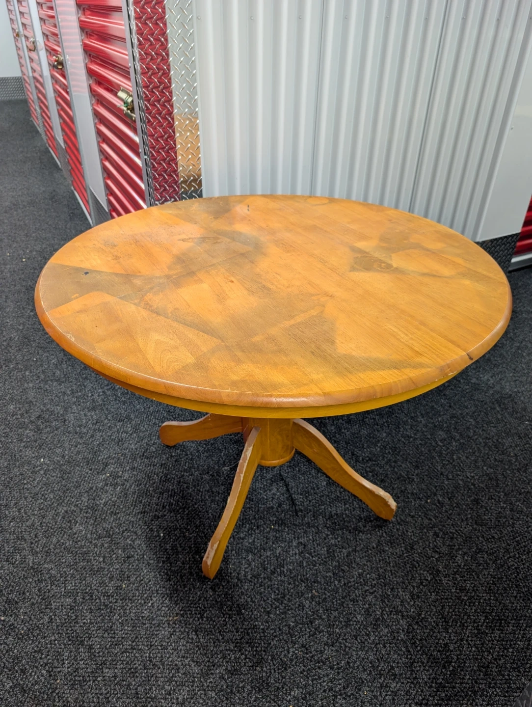 Selling a round wooden dining table. It has a classic design with a pedestal base and four legs. The table has a warm, honey-colored finish. It would be a great addition to any home!
