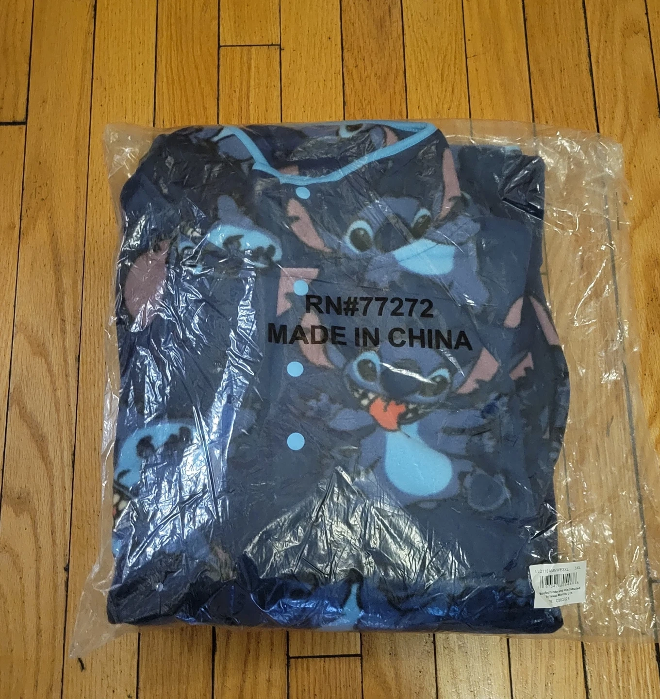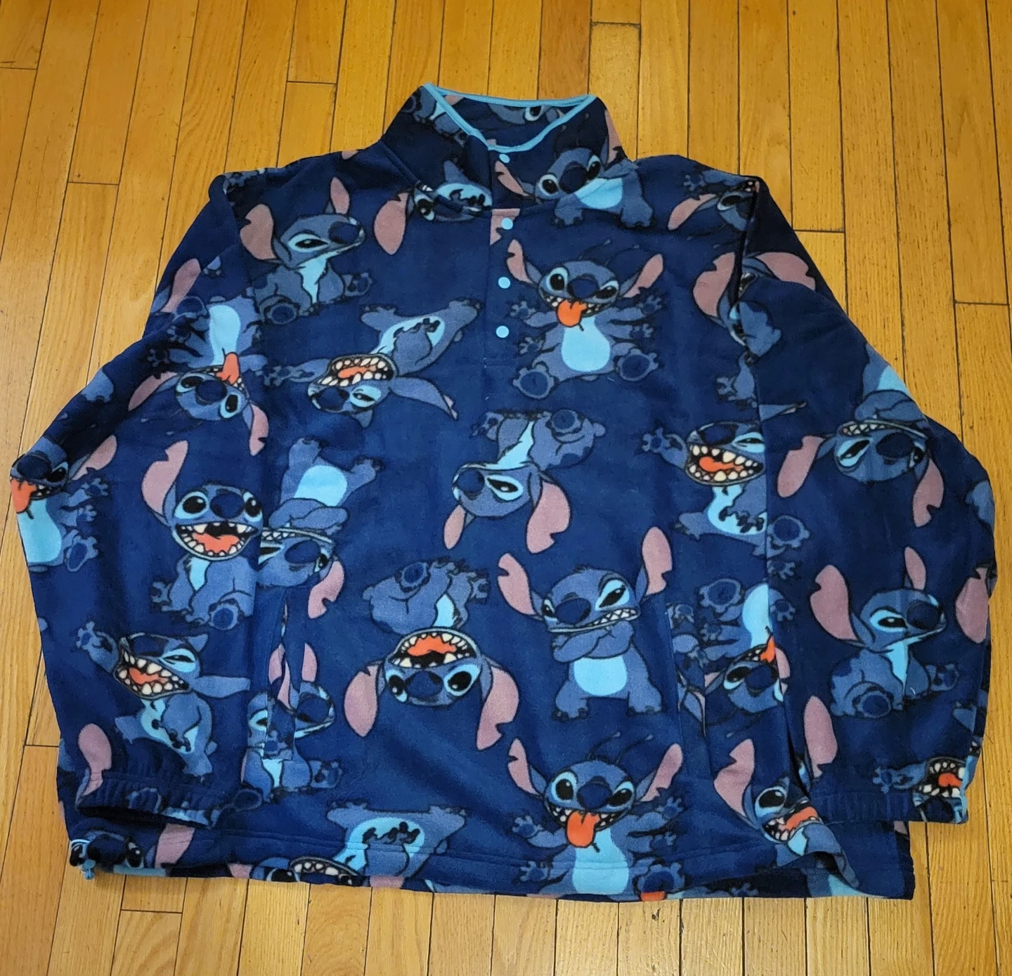 I'm selling a brand new Disney Stitch fleece pullover! It's a size XXXL and still in its original packaging! The pullover is a fun blue color with an all-over print of Stitch. It's made of 100% polyester and super cozy