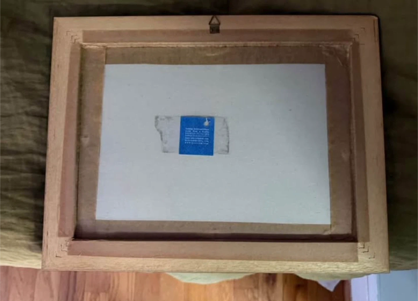 It came already framed. One corner of the frame is a little dented but when it’s hanging you don’t see.