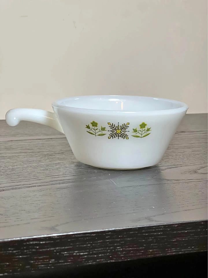 Vintage Anchor Hocking Fire King Meadow Green handled soup bowl.