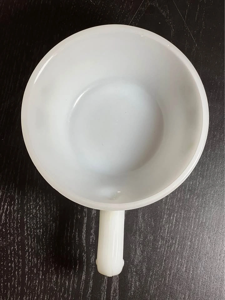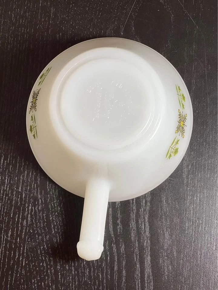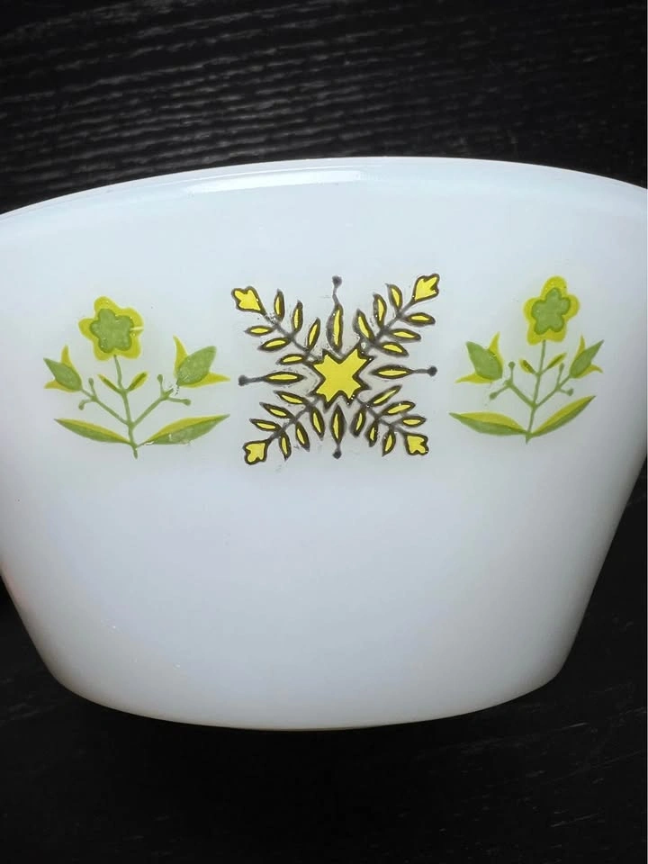 The bowl is made of milk glass and features a green and yellow floral pattern.