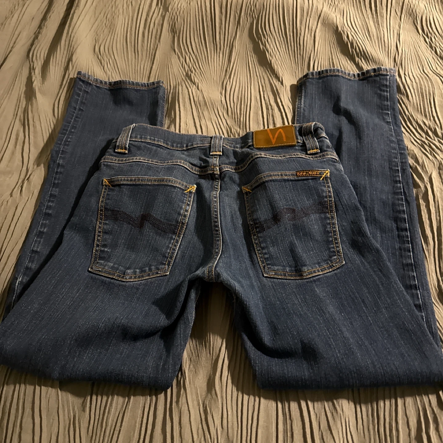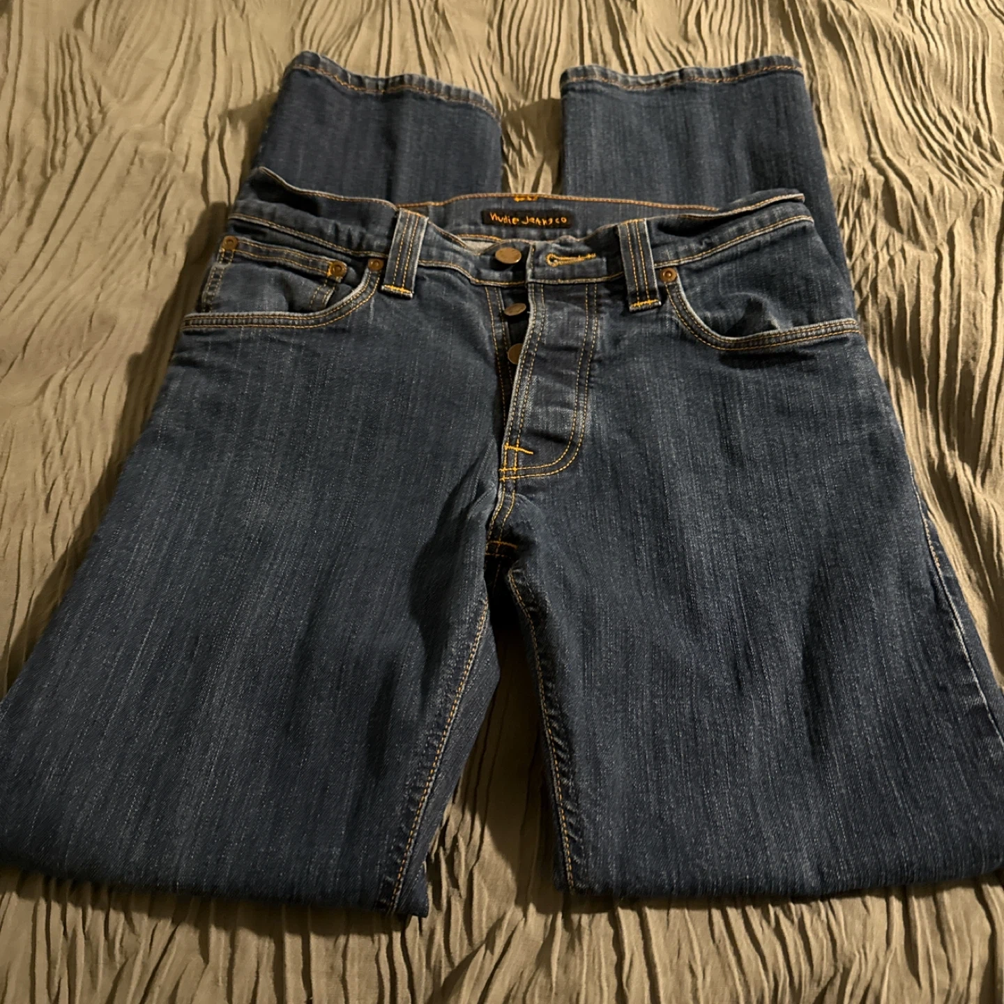 Selling a pair of Nudie Jeans in size 32/34. These are made from organic denim, so they're both stylish and eco-friendly. The jeans feature pure copper buttons and are washed in a way that utilizes natural treatments like sugar enzymes and ozone. A great pair of jeans!