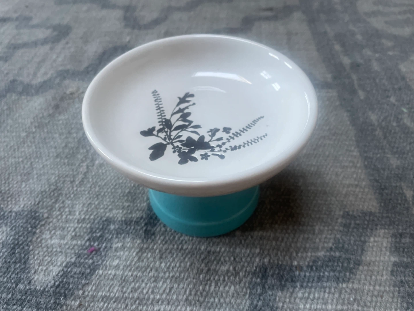 This is a white ceramic pet bowl with a delicate black floral design. It sits on a sturdy teal-colored stand, elevating it slightly. It's perfect for feeding your small pet. Material is ceramic.