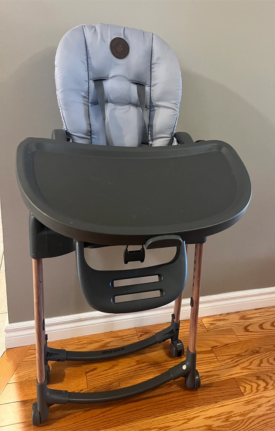 Selling a Maxi-Cosi high chair in great condition! It features a comfortable padded seat and a convenient tray for easy feeding. The legs have a wood-like finish, adding a touch of style to your dining area. Perfect for little ones ready to join family meals