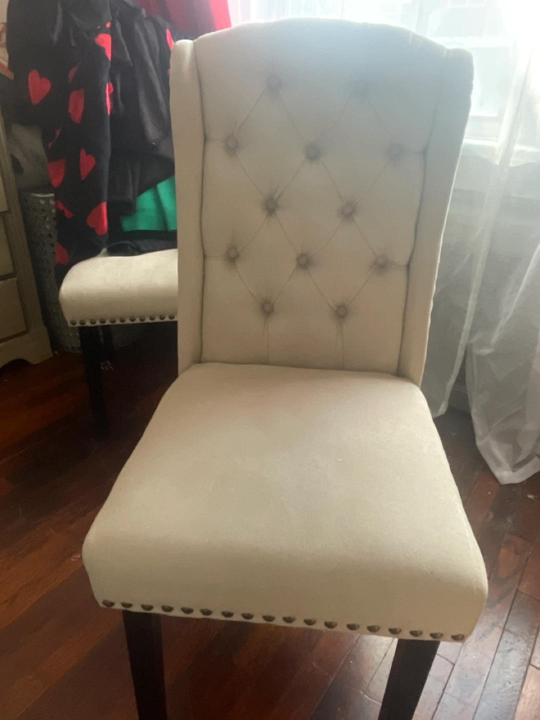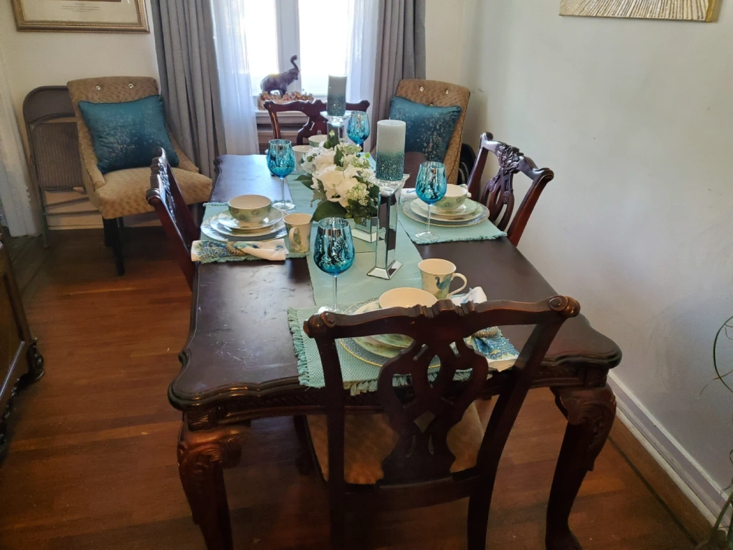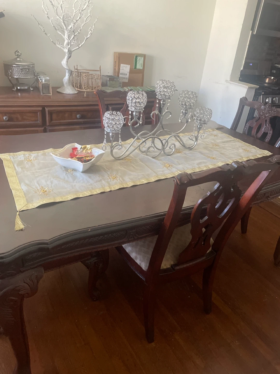 Selling a dining table with six chairs. The wood table with center leaf extension and has a dark finish. The chairs are a mix of styles, some with upholstered seats and others with carved wooden backs. Great for family dinners or entertaining guests!