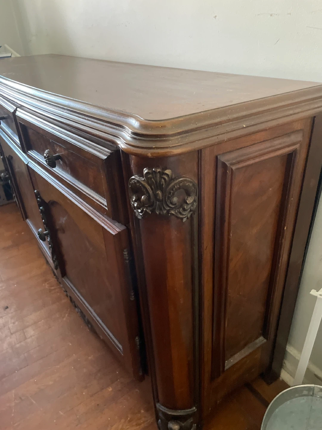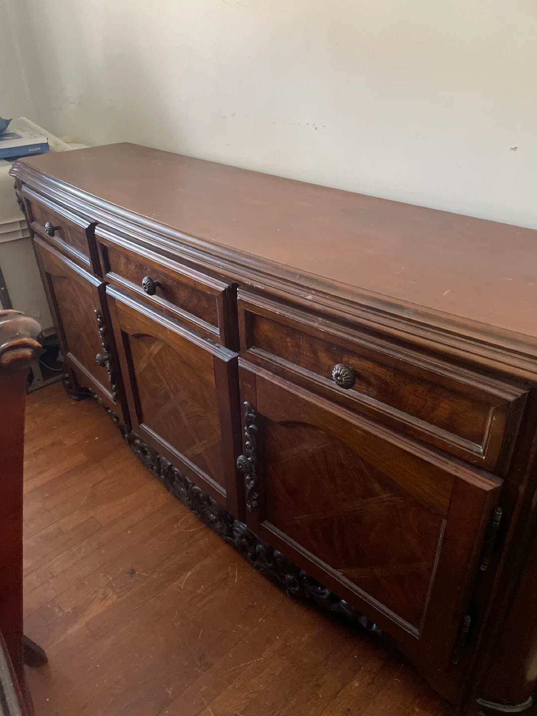 Beautiful antique wooden buffet/sideboard with ornate detailing. It features drawers and cabinet space for storage. A great piece to add some vintage charm to your dining room!