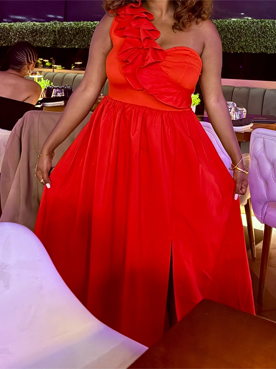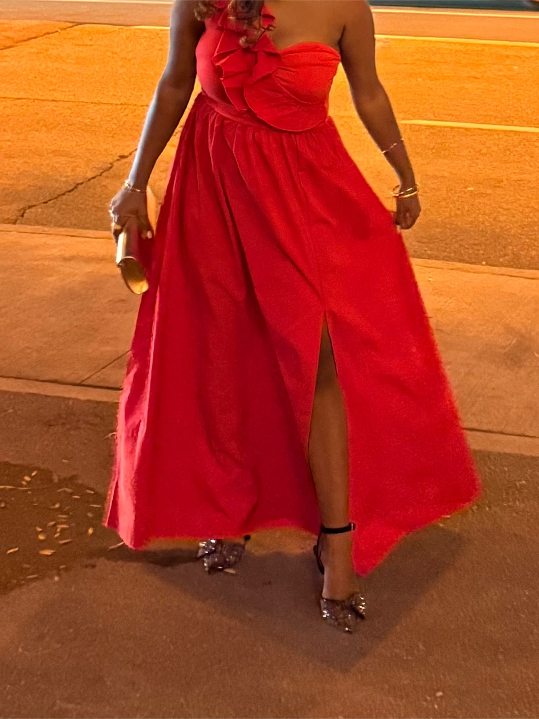 Beautiful red maxi dress with a one-shoulder design and ruffle detailing. The dress has a stylish slit. Perfect for a special occasion!