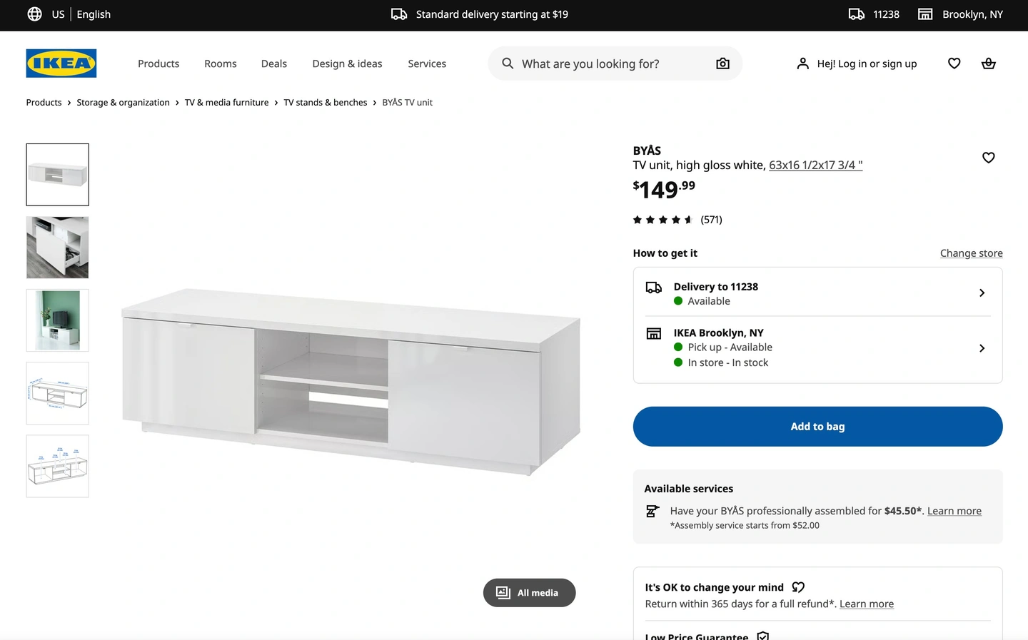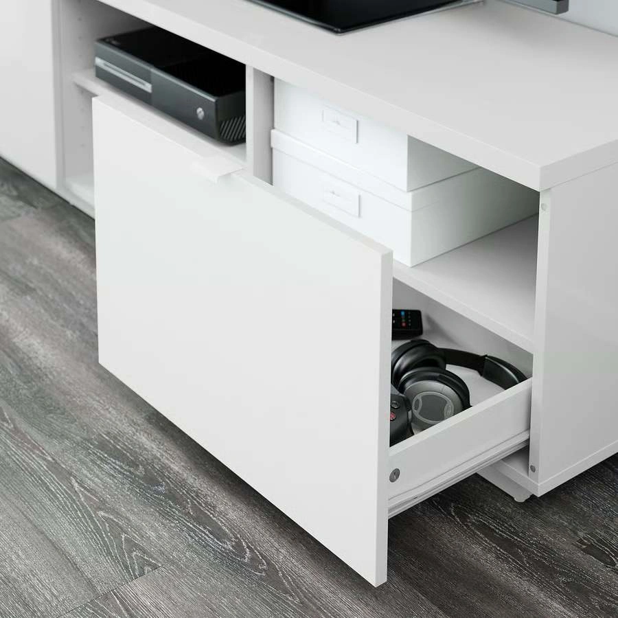 10TV unit, high gloss white, 63x16 1/2x17 3/4 " With open storage it’s easier to get an overview, and with closed storage you can keep things nice and tidy. This TV bench has both, and an adjustable shelf in each section too.