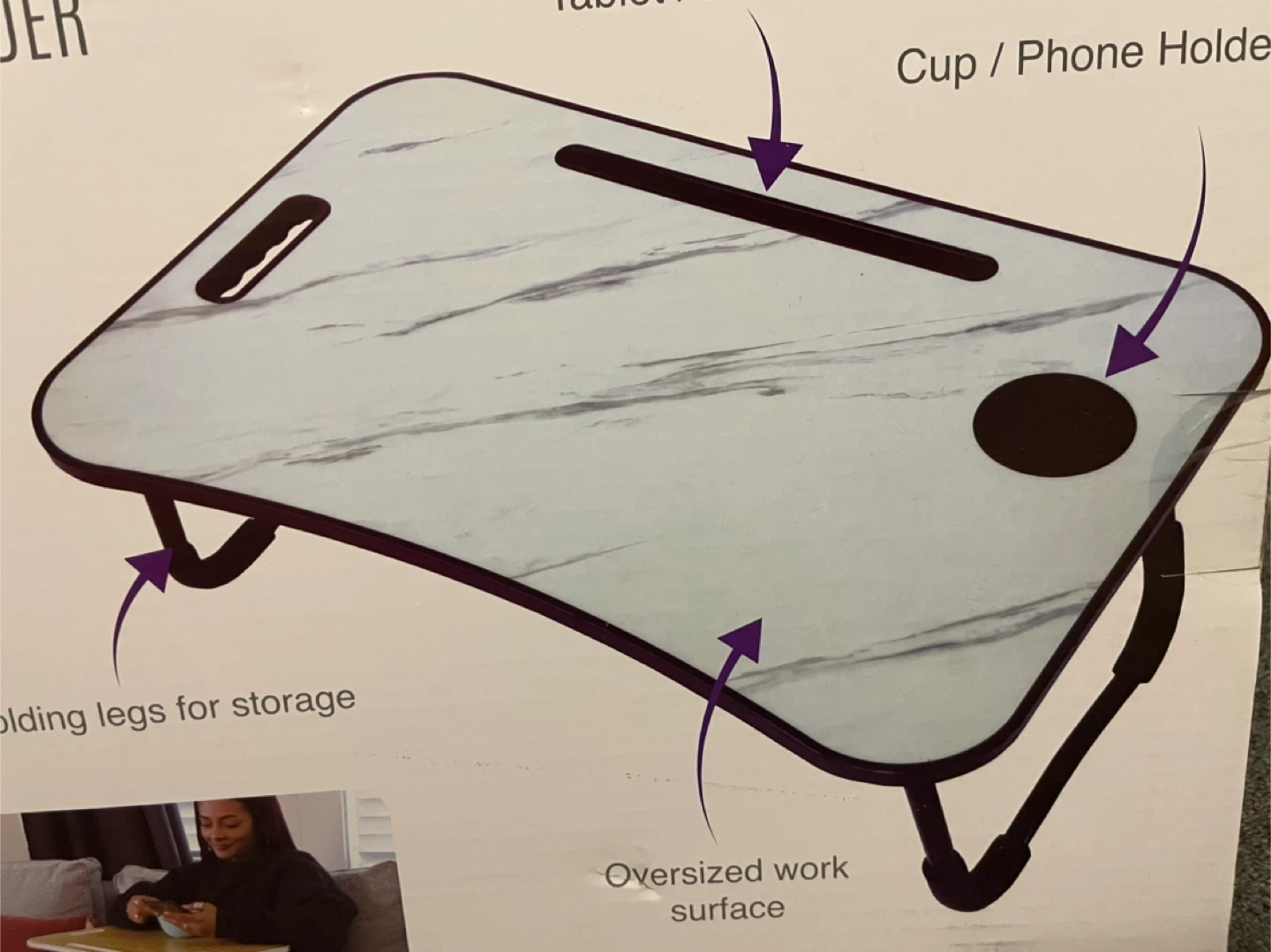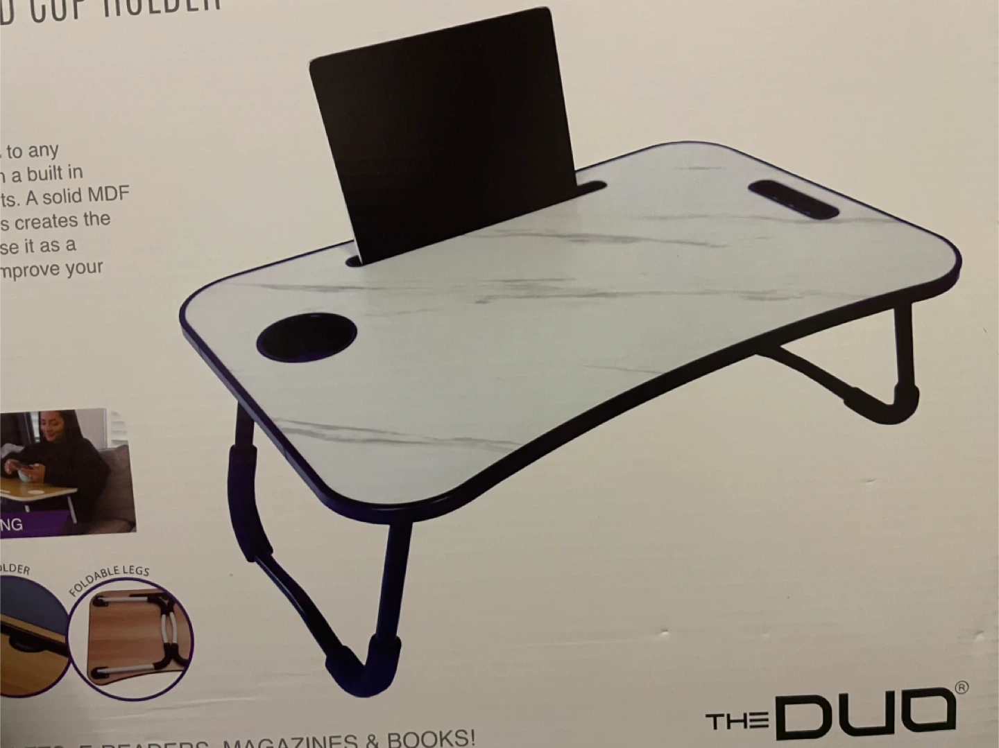 Selling a portable workstation with a white marble finish. It features a tablet stand and a cup holder. It's a versatile workstation that adapts to any environment. It fits a 17" laptop with a built-in display dock for phones and tablets. It has folding legs for storage and an oversized work surface. The workstation is made of solid MDF.