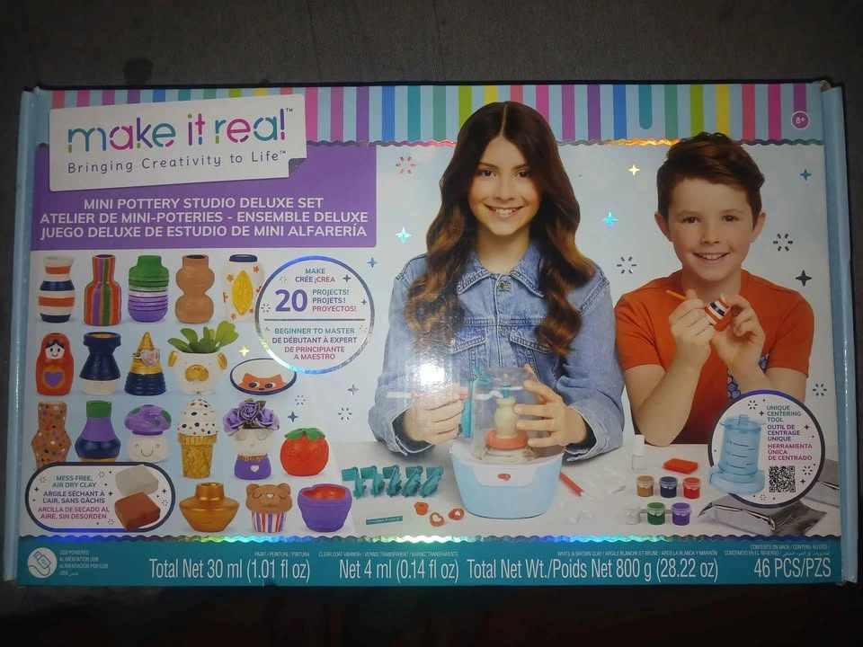 Brand New Mini Pottery Studio Deluxe Set Makes 20 projects for ɓeginner to master mess free, air dry clay, unique centering tool comes with 1 mechanical unit, 1 storage base, 1 mess free dome, 4pcs centering tool, 1 removable rotating wheel, 1 plastic sheet, 2 double-sided carving tools, 8 tool tips, 1axle, 6 template guides, I bag brown clay, 1 bag white clay, 1 sponge, 6 colors of paint, 1 paintbrush, 1 bottles clear coat varnish; 3 clay punches, 3 clay cutters, 1 plastic cutter, 1foam pad sheey, 1 playbook.