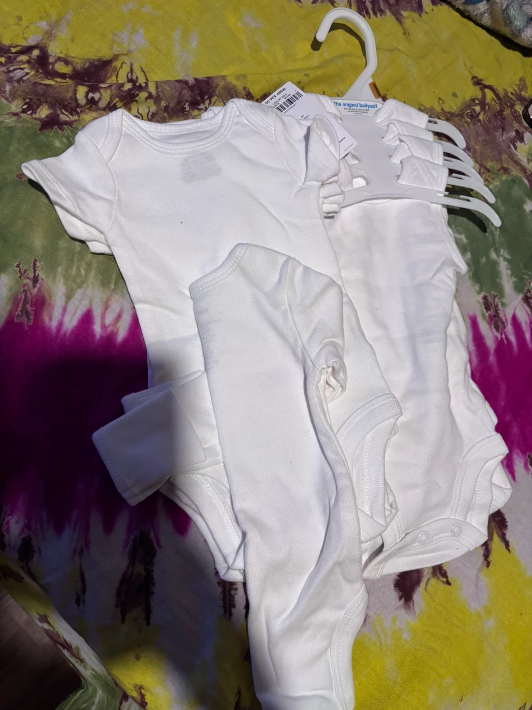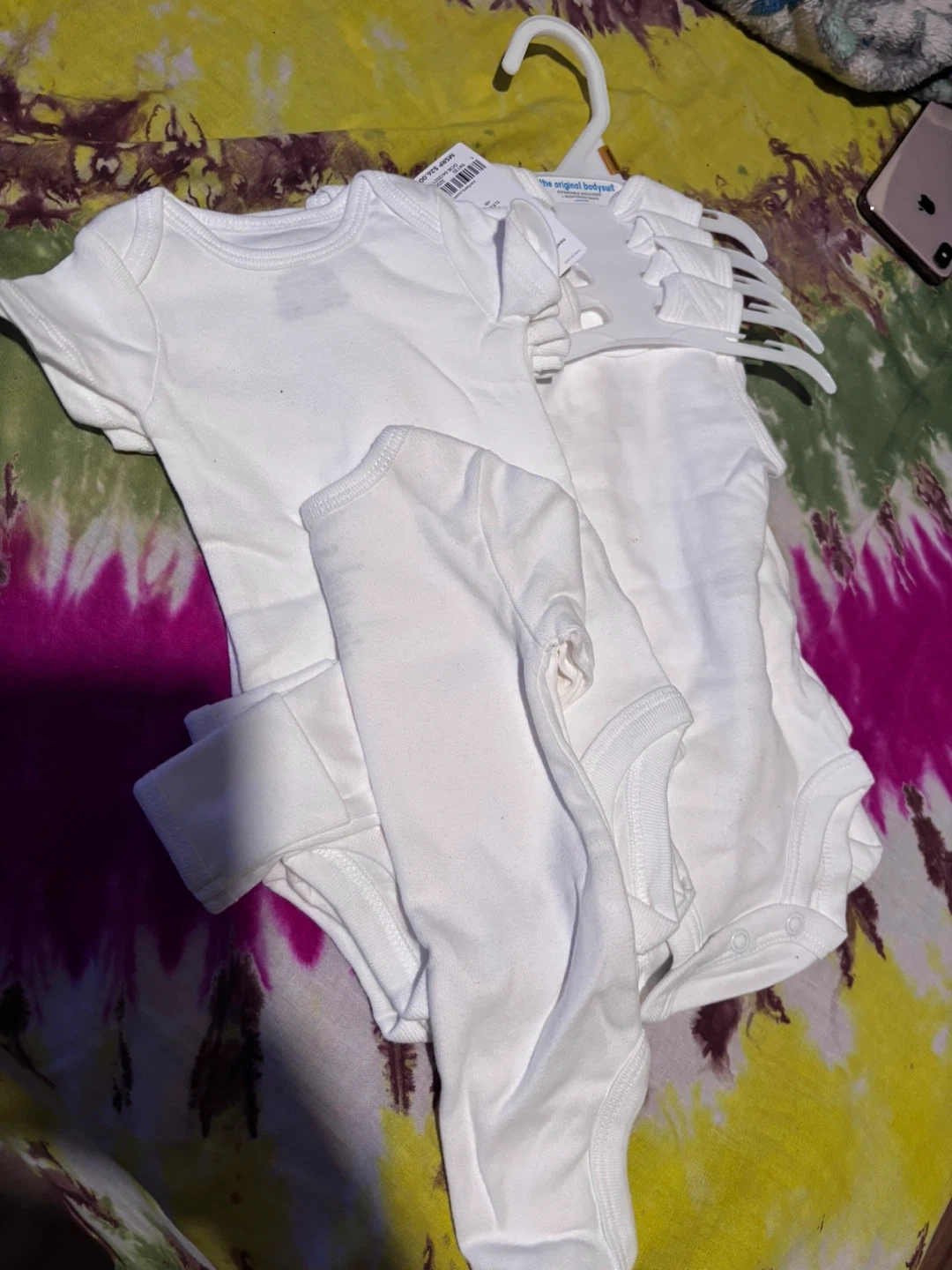 I'm selling a set of new white bodysuits. They are the original bodysuit brand. Perfect for your little one! 8 piece