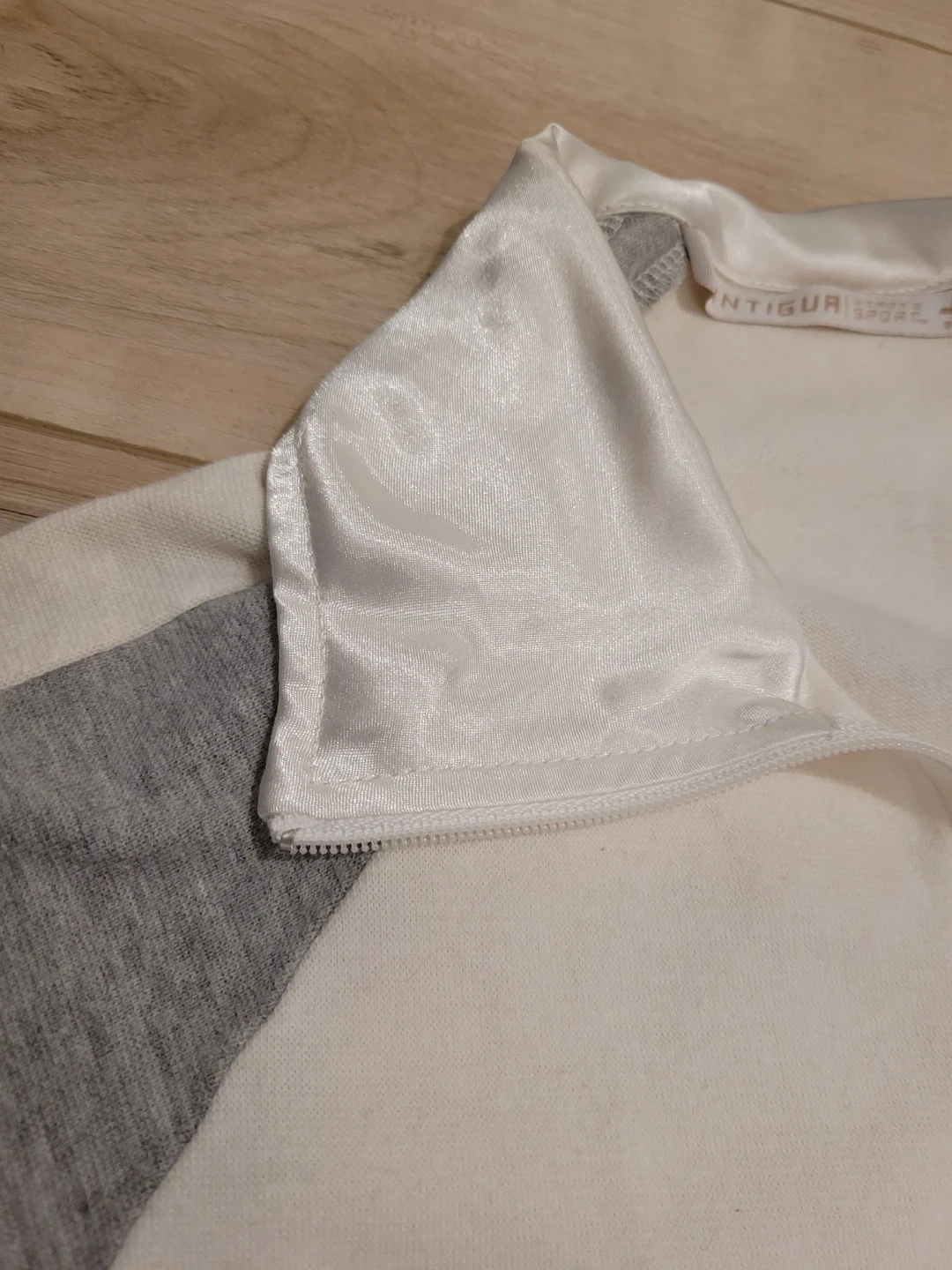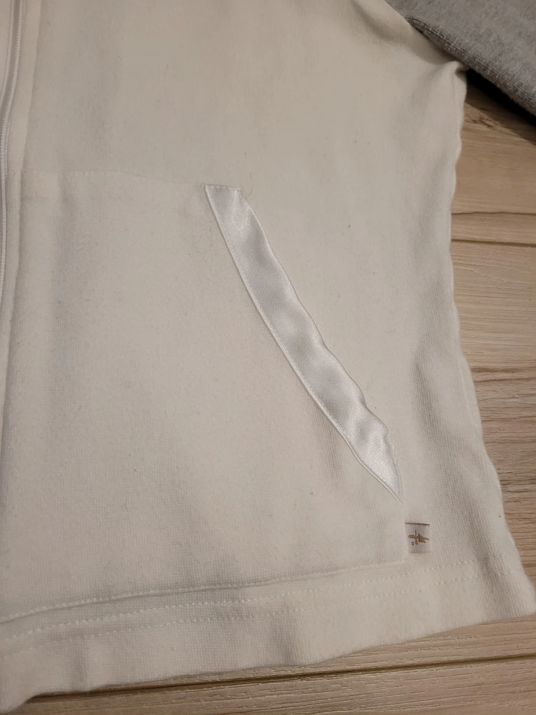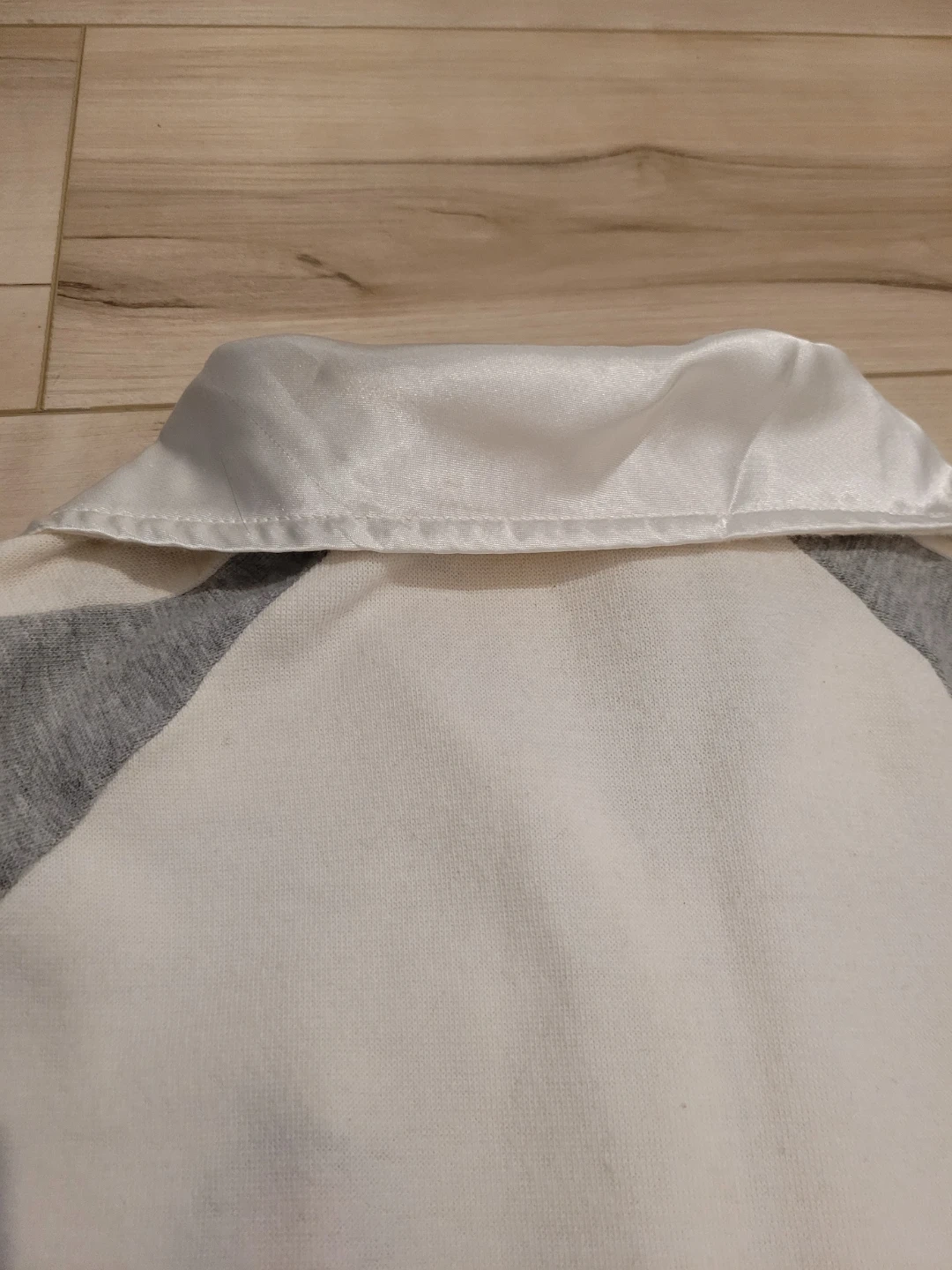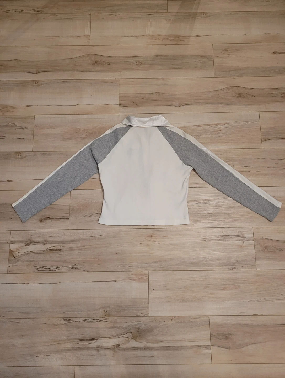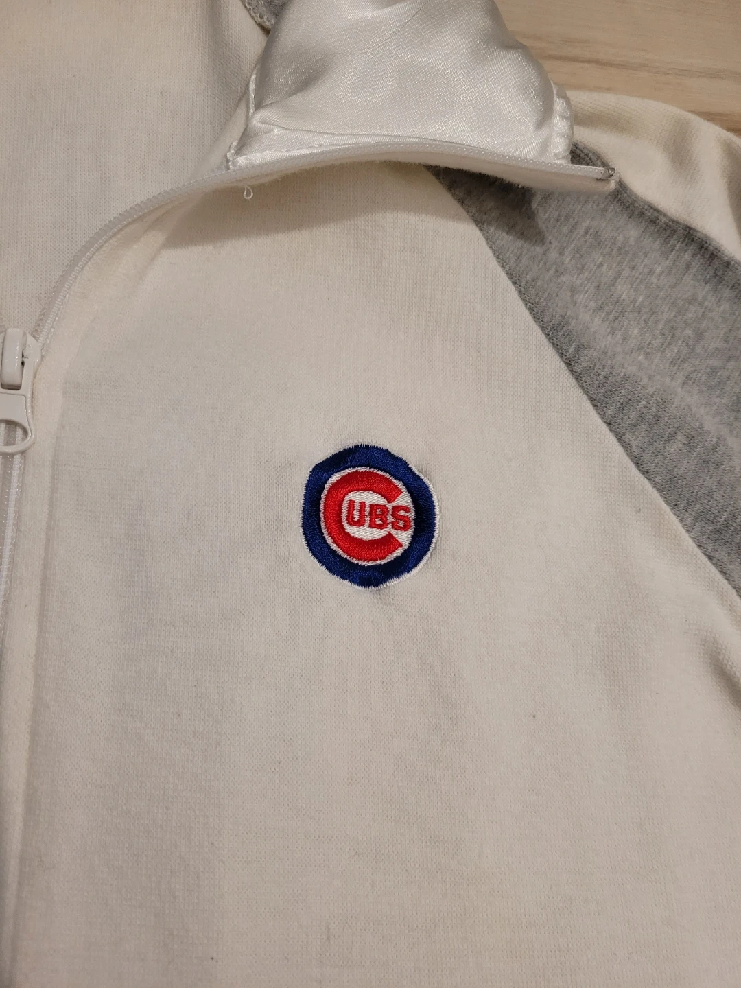 Selling a cute Antigua women's Chicago Cubs long sleeve zip up sweatshirt. It's a size small and made of 97% cotton and 3% spandex. The jacket features a white body with gray sleeves and a Cubs logo. Lovely satin looking details on collar, sleeves, and pockets. Approximately just under 19" from shoulder to bottom of shirt and 17" from underarm to underarm. Good condition with minor wear and believe it to be from 2004. I do see a small spot on sleeve see close up photo for detail.