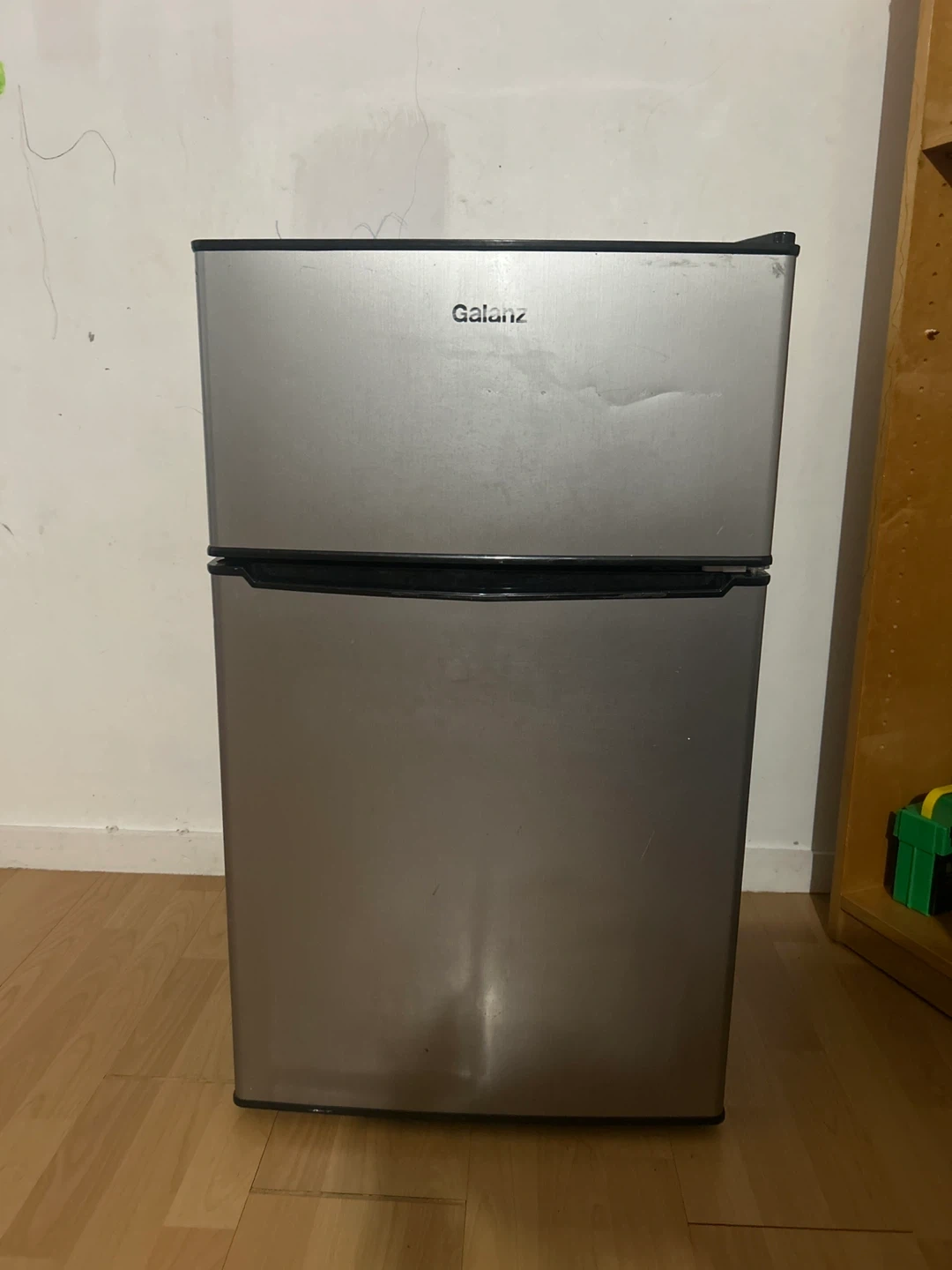Selling a Galanz compact refrigerator in silver. It's a great size for a dorm room, office, or small apartment. It has a separate freezer compartment and adjustable shelves. It is in good condition and ready for a new home!