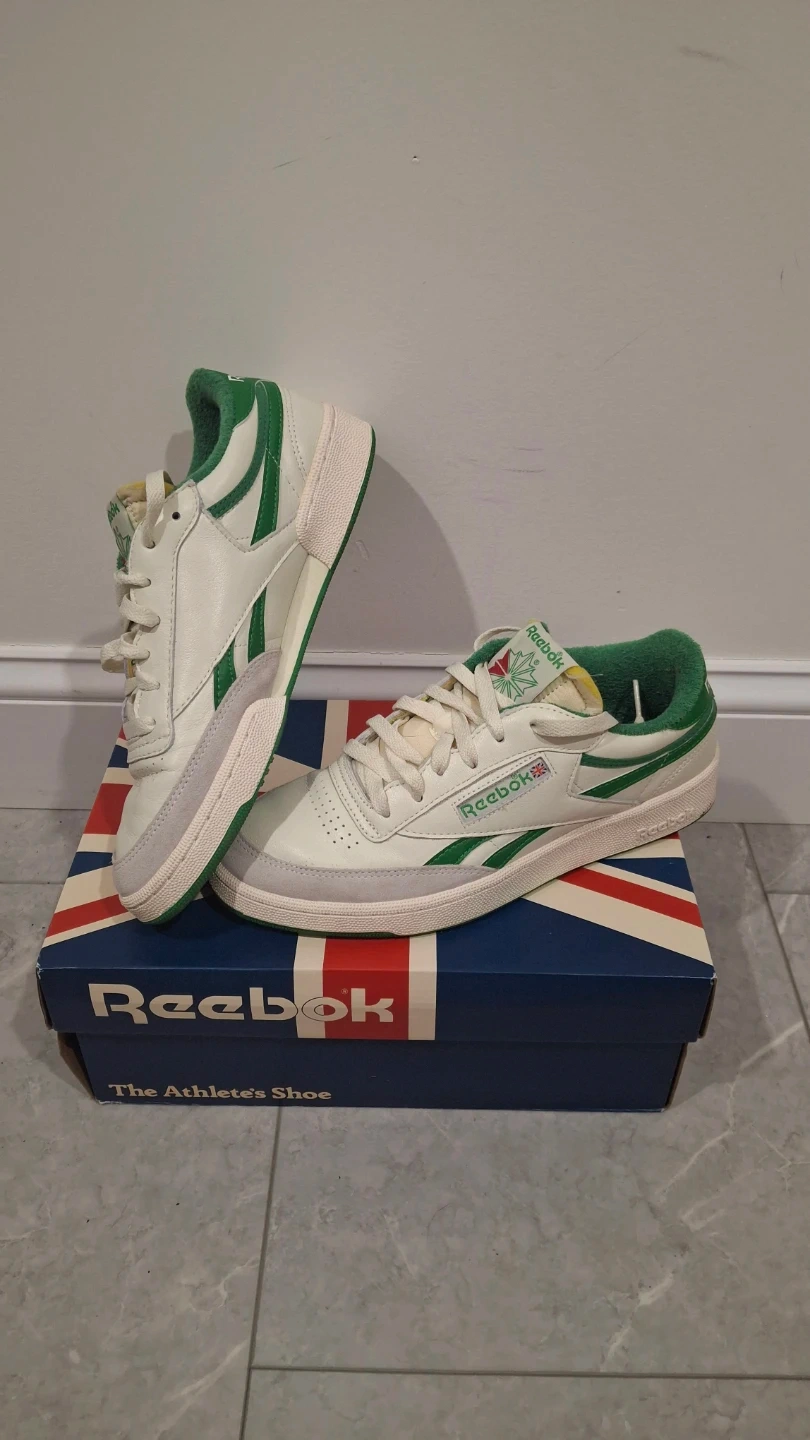10Selling a pair of Reebok Club C Revenge sneakers in white and green! They come with the original box