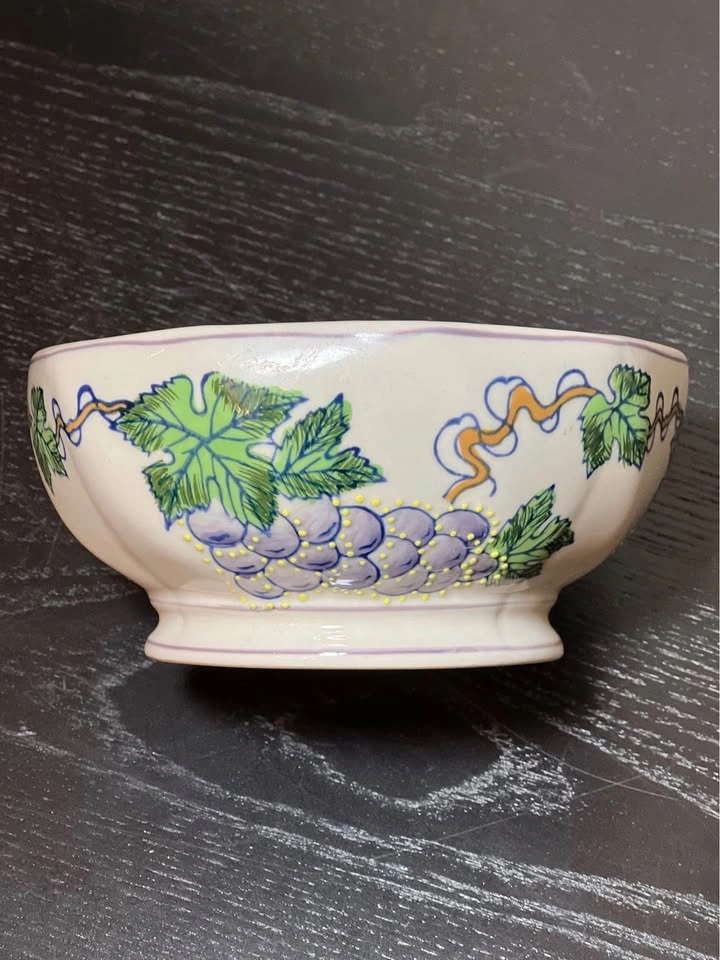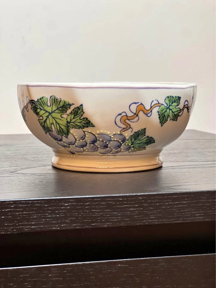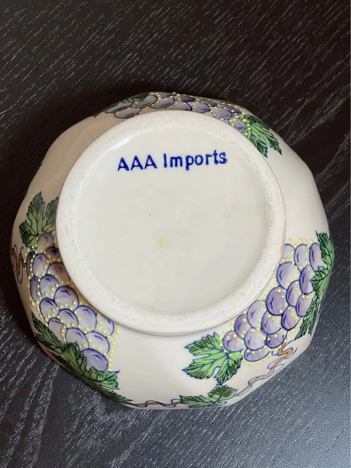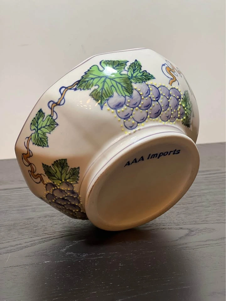 131This item is a vintage AAA Imports ceramic planter or bowl featuring a hand-painted grapevine and grape cluster design. It is part of the company's "Decoware Fine Pottery" collection. Manufacturer: AAA Imports Inc. Collection: Decoware Fine Pottery Design: The piece features a glazed finish with a raised, multicolor design of green leaves and purple grapes. Material: Ceramic Used - Sold as is