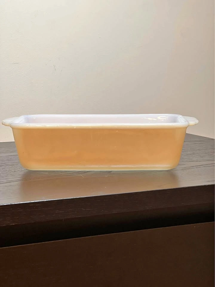 131The product is a vintage Fire King Peach Lustre loaf pan. Manufacturer: Anchor Hocking Product Line: Fire King Oven Ware Color/Finish: Peach Lustre Common Model Numbers: 409 with a 1-quart capacity