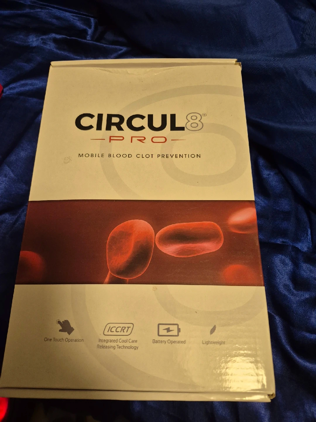 Selling a Circul8 Pro device designed for mobile blood clot prevention. It features one-touch operation and integrated cool care releasing technology. It's battery operated and lightweight for easy use on the go