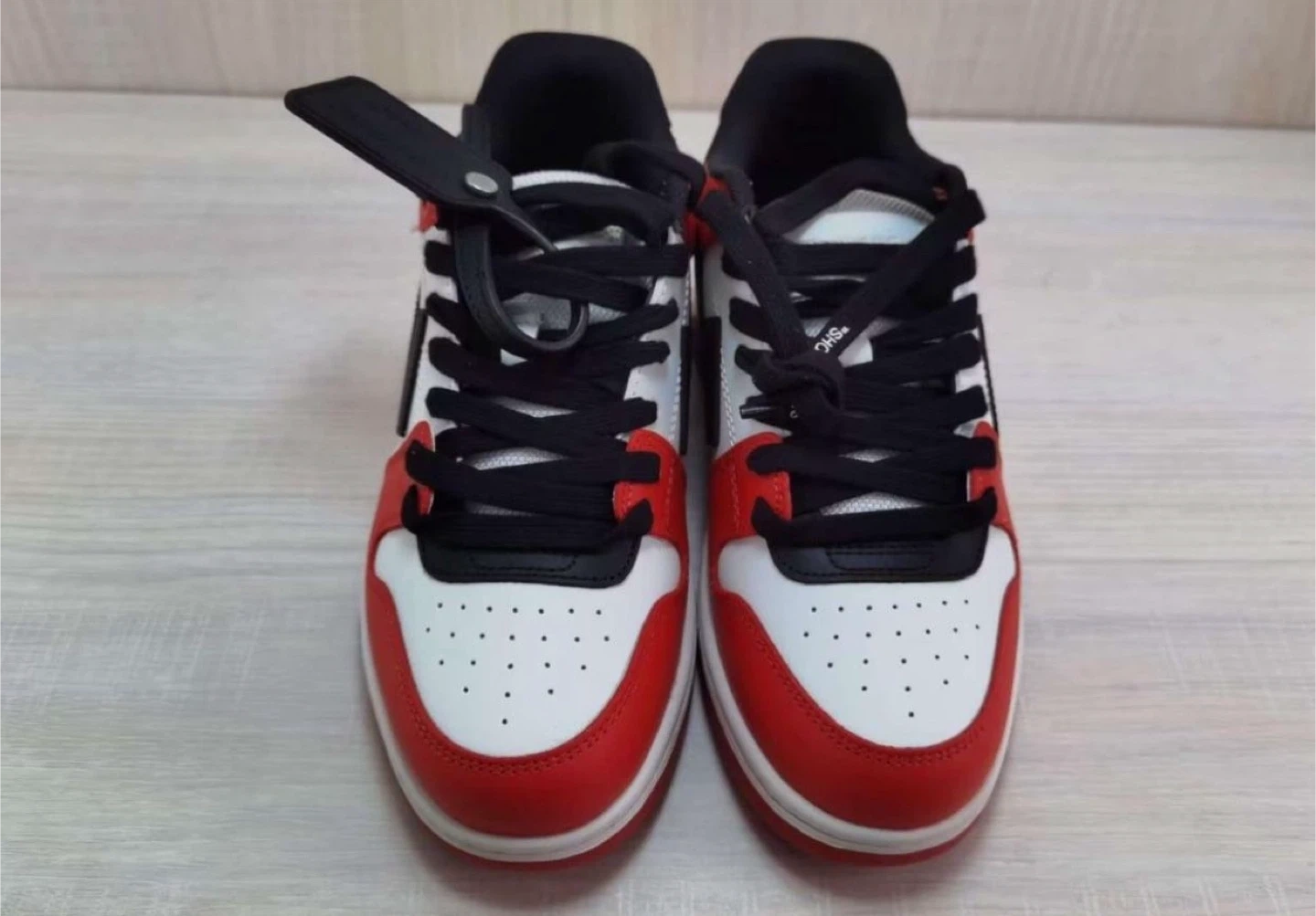 Selling a pair of Off-White Out Of Office (OOO) sneakers in a striking red and white colorway! These stylish sneakers are in great condition and ready for a new home. They feature the iconic Off-White arrow logo and are perfect for adding a touch of luxury to your everyday look. Don't miss out on these sought-after kicks!