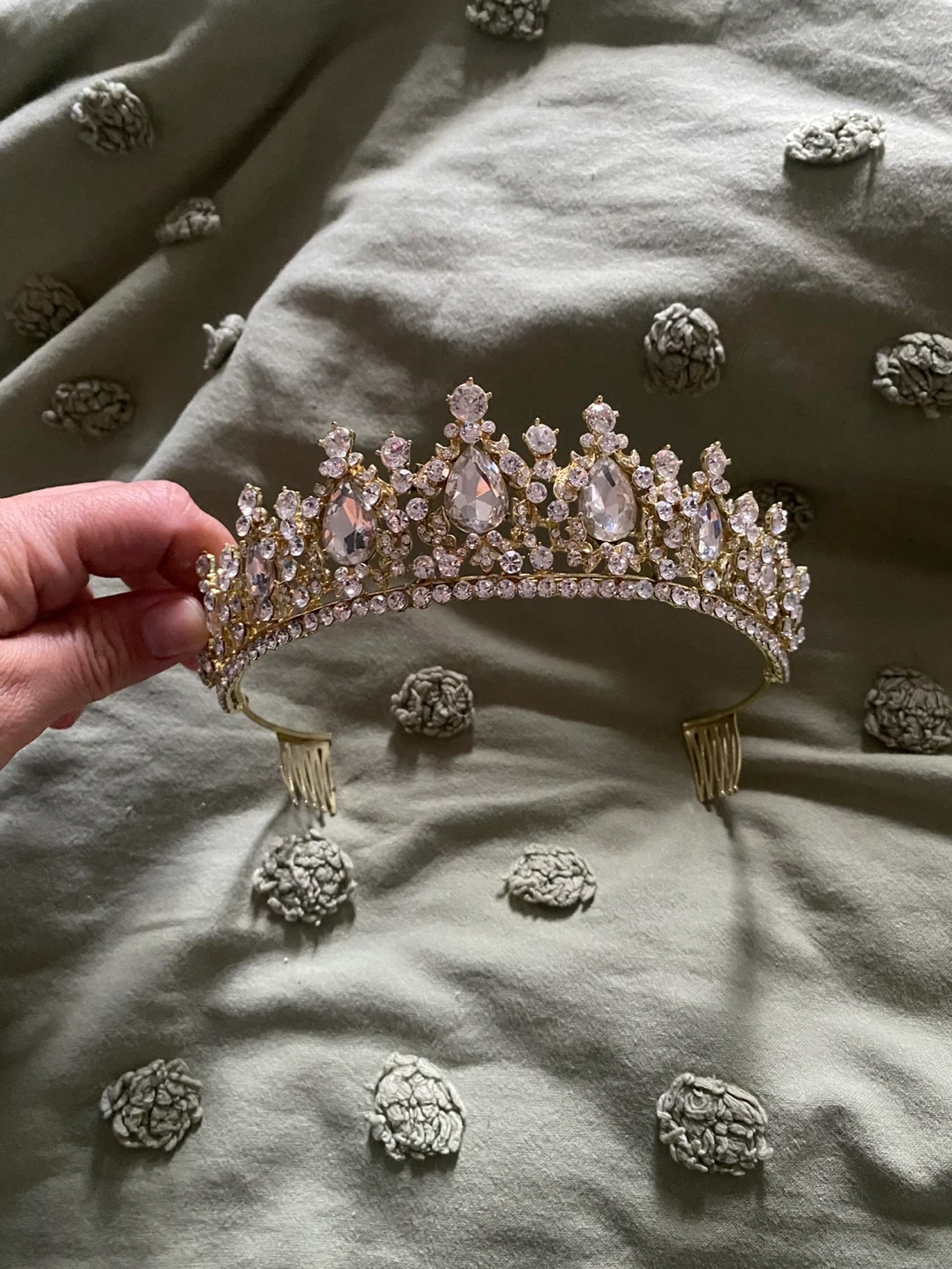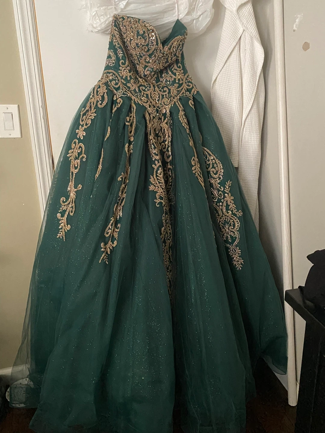 Selling a beautiful green and gold quinceanera dress with a matching tiara sold separately $100. The dress is in great condition and perfect for a special celebration!