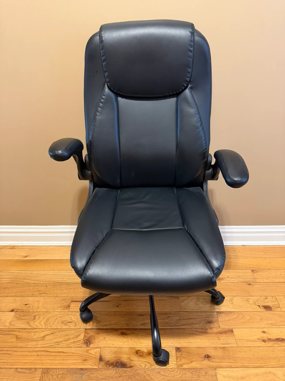 Selling a comfortable black executive office chair. It's in great condition and perfect for your home office or workspace. The chair features a high back, padded armrests, and adjustable height for maximum comfort. The chair also comes with a seat cushion.