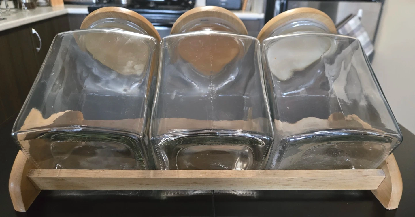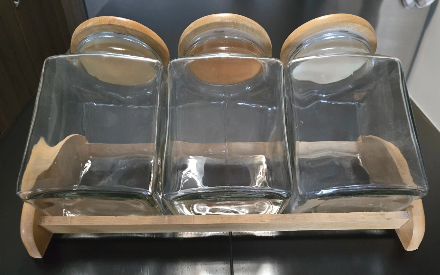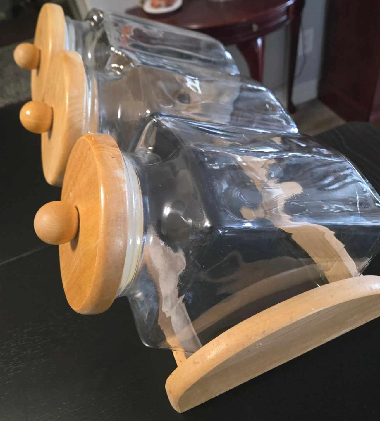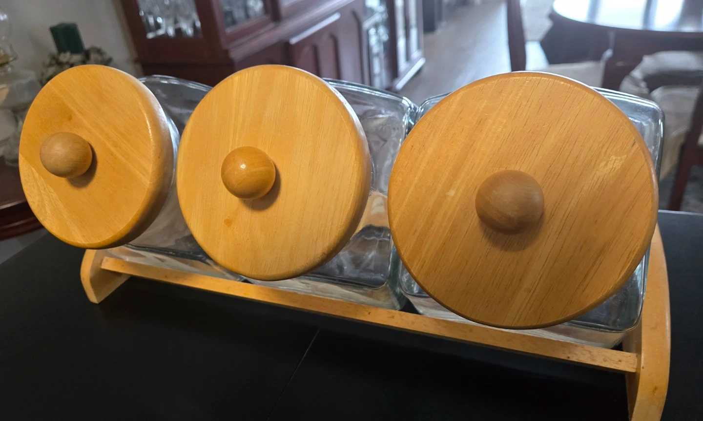 115Selling a set of three Vintage glass Cannisters each with a wooden lid and Wooden Stand. They're in great shape and ready to hold your goodies!