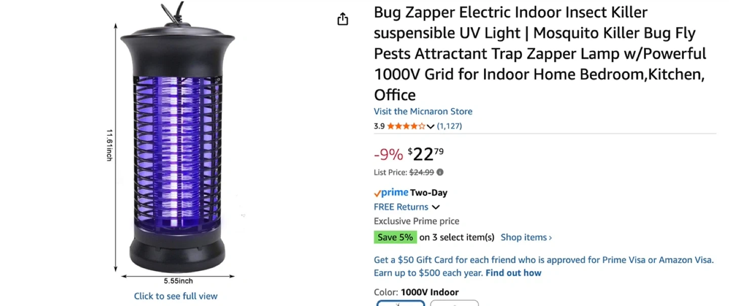 I'm selling a Bug Zapper Electric Indoor Insect Killer! It features a suspensible UV Light and a 1000V Grid. It's perfect for indoor use in your home, bedroom, kitchen, or office. The dimensions are 11.61 inches in height and 5.55 inches in width. Originally listed for $24.99, it's now available!