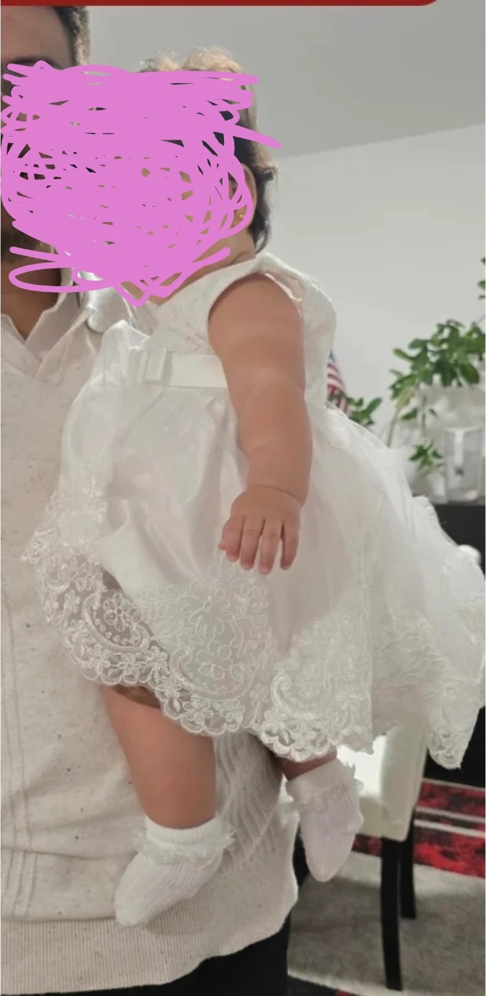 21This is a beautiful white baby dress that comes with a matching headband! It's perfect for special occasions or photoshoots. The dress features delicate lace detailing and a large bow accent. It's in great condition and ready for a new little owner!