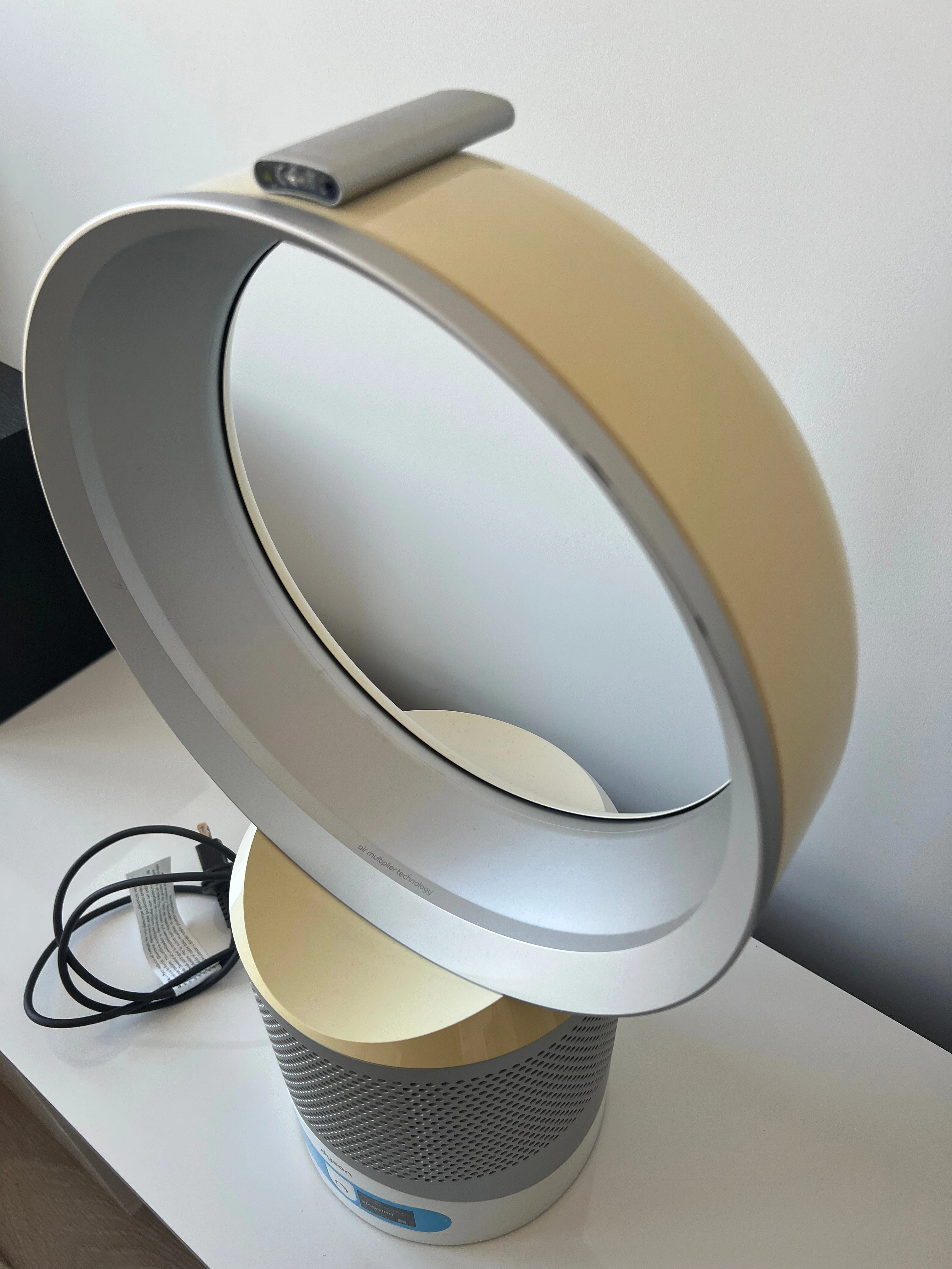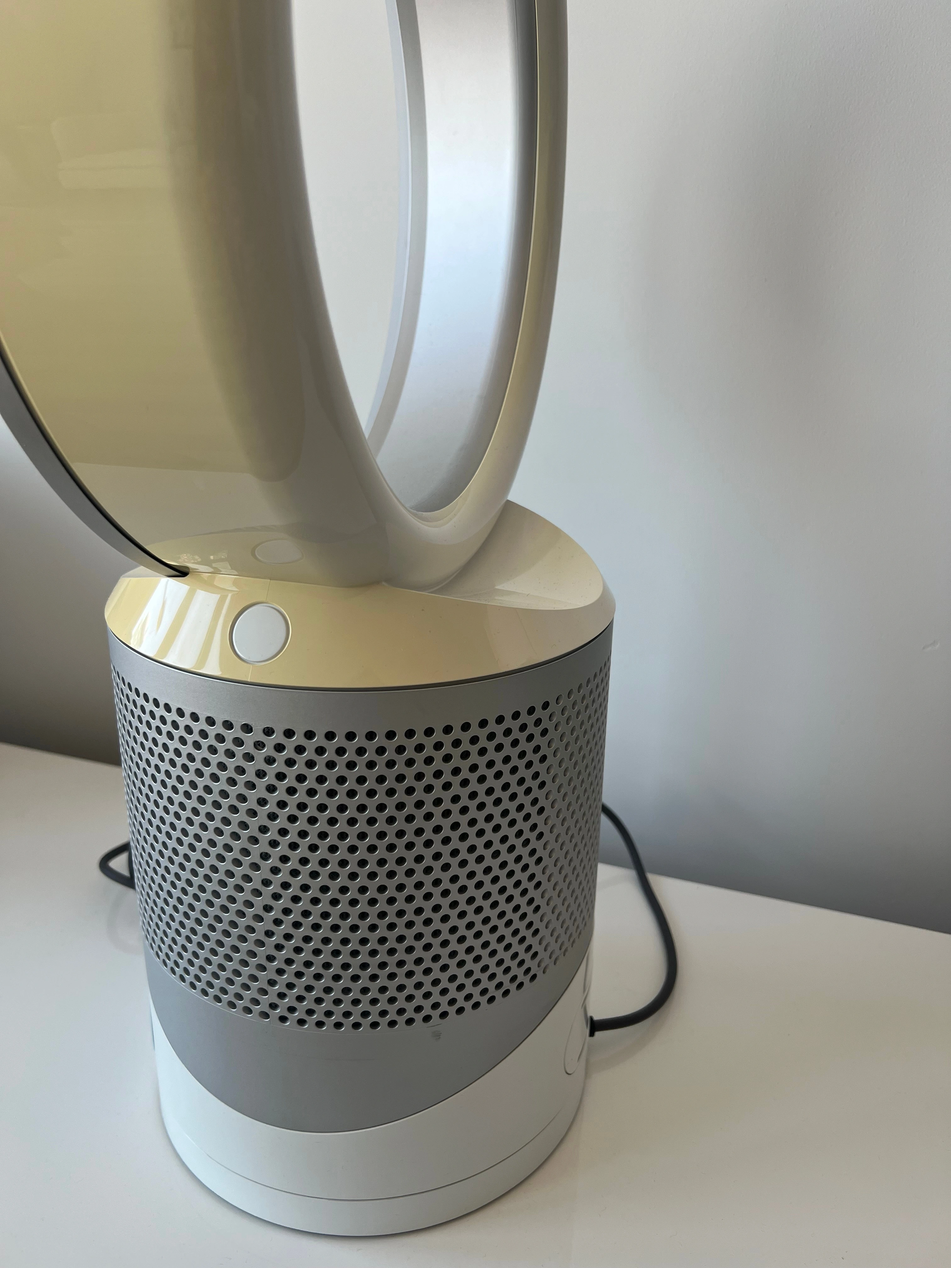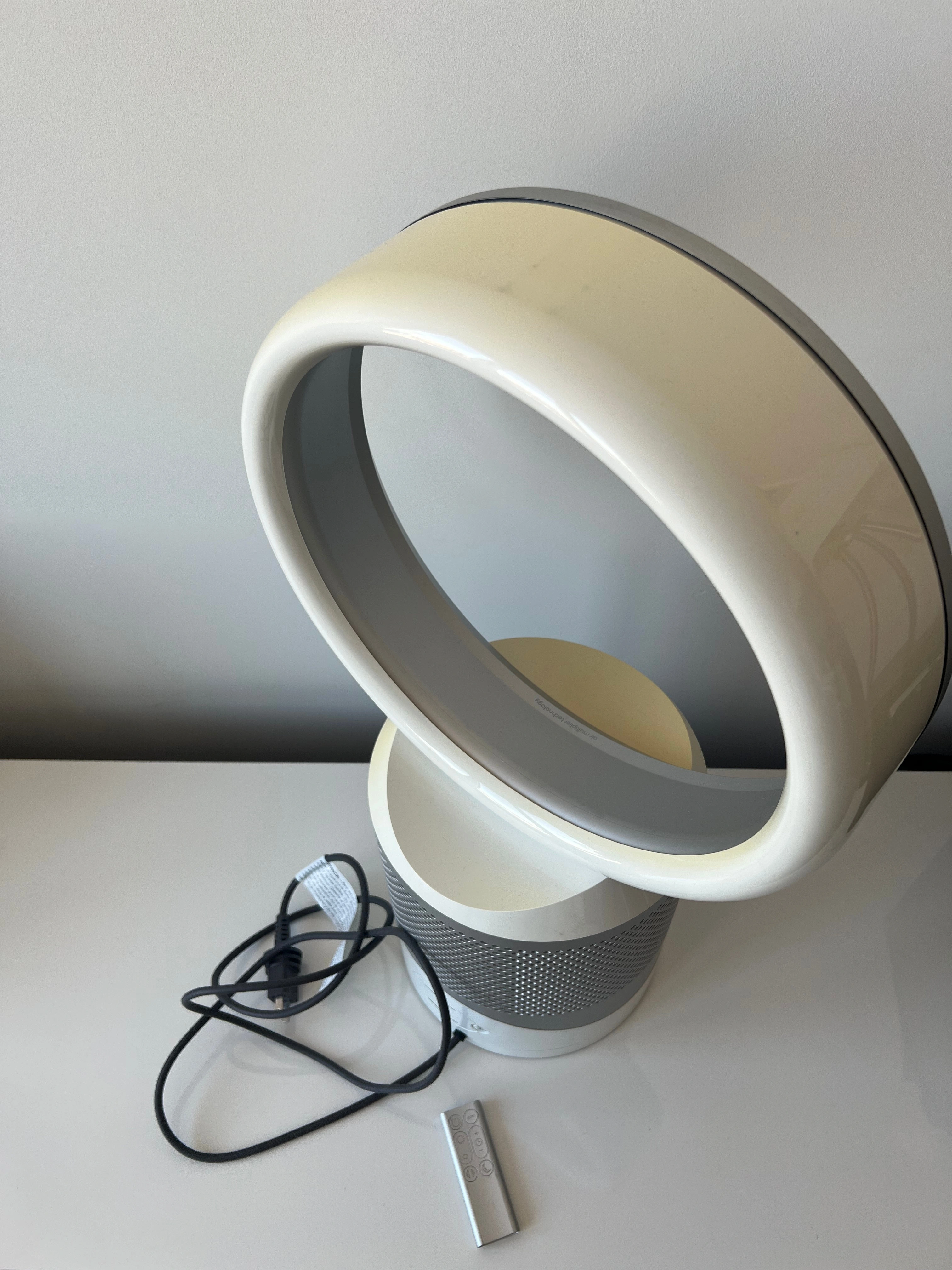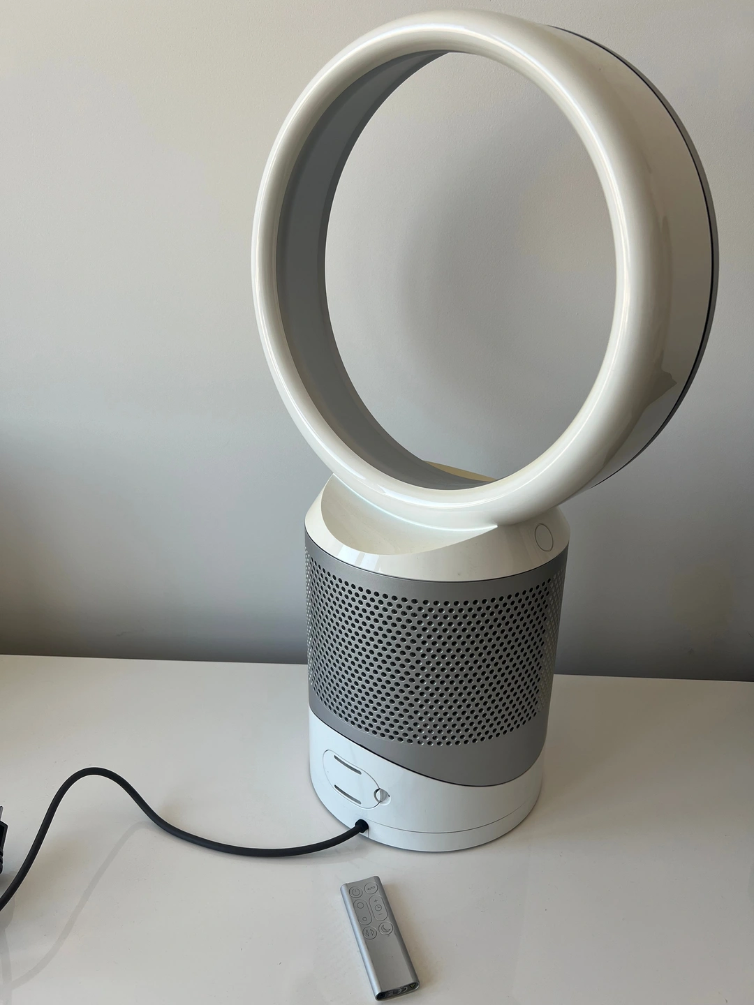 98This is a used, working Dyson DP01 bladeless desk fan, complete with the remote control. This fan has been tested and found to be working. The fan blows air smoothly and oscillates properly when that setting is selected. There’s a bit of discoloration on the loop, which you can see in the photos, but it doesn’t affect performance. Please see all photos for full details of the condition.