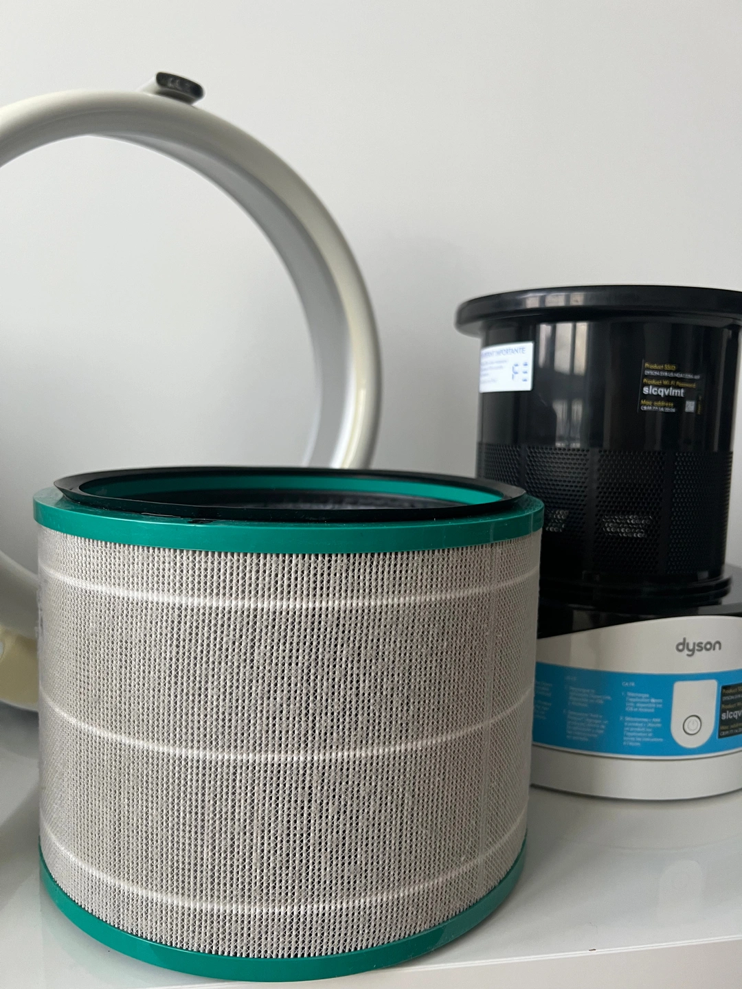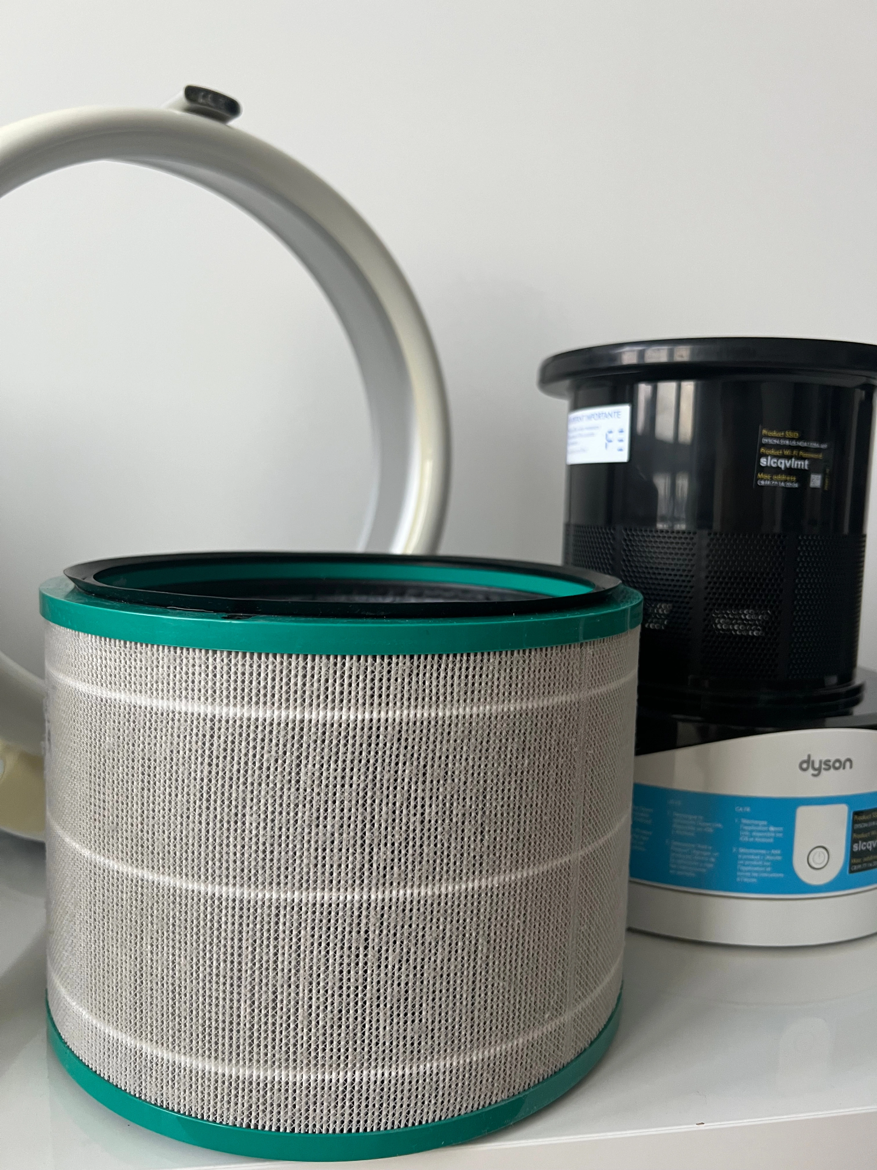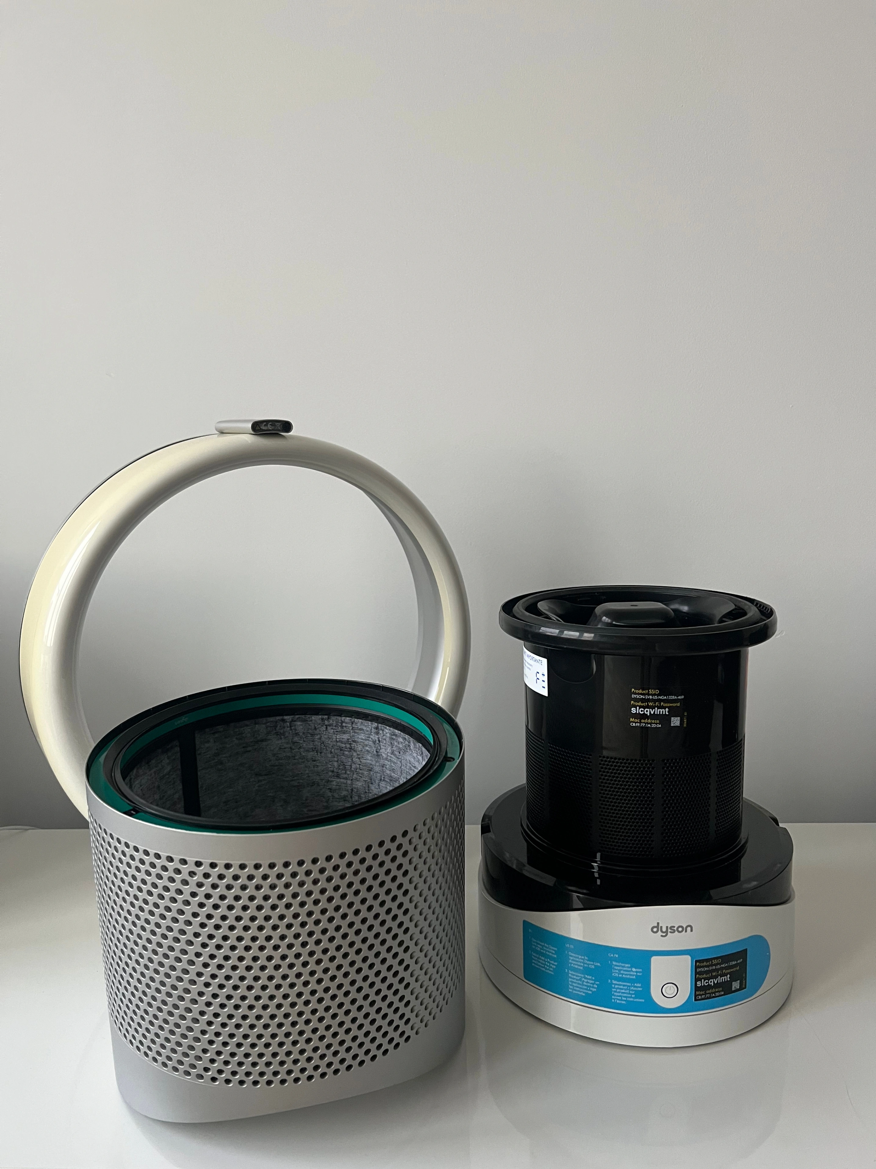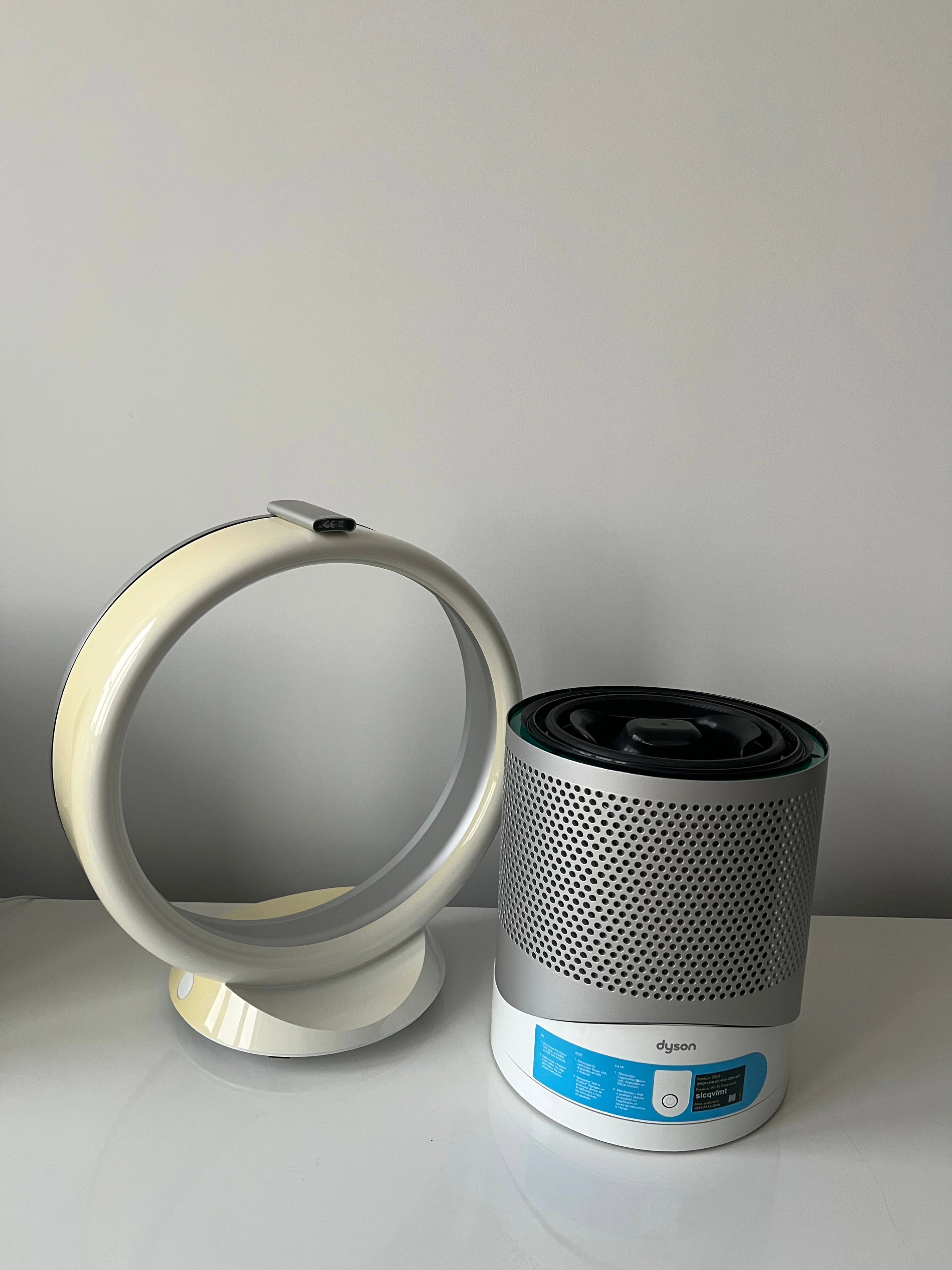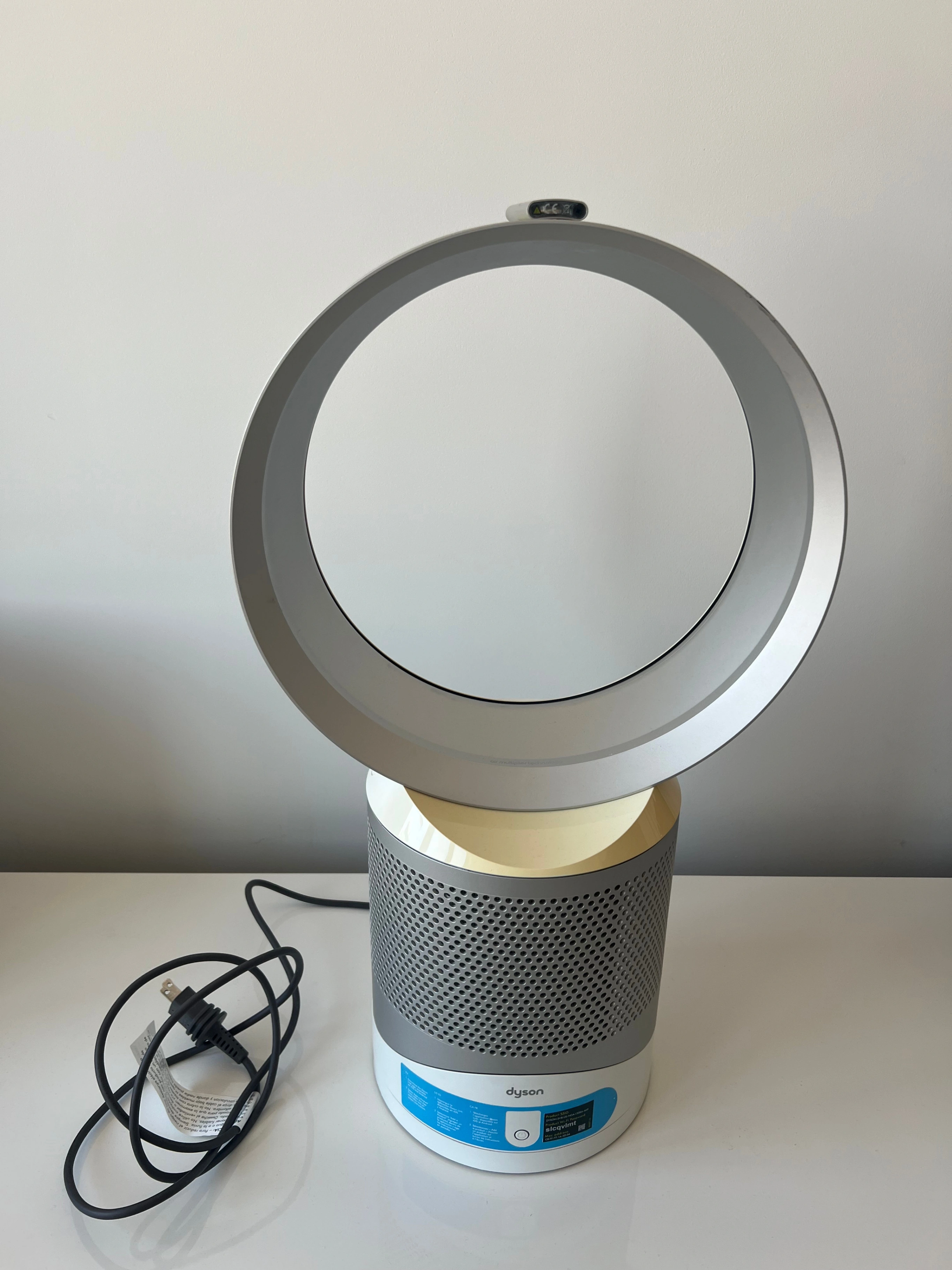 98This is a used, working Dyson DP01 bladeless desk fan, complete with the remote control. This fan has been tested and found to be working. The fan blows air smoothly and oscillates properly when that setting is selected. There’s a bit of discoloration on the loop, which you can see in the photos, but it doesn’t affect performance. Please see all photos for full details of the condition.