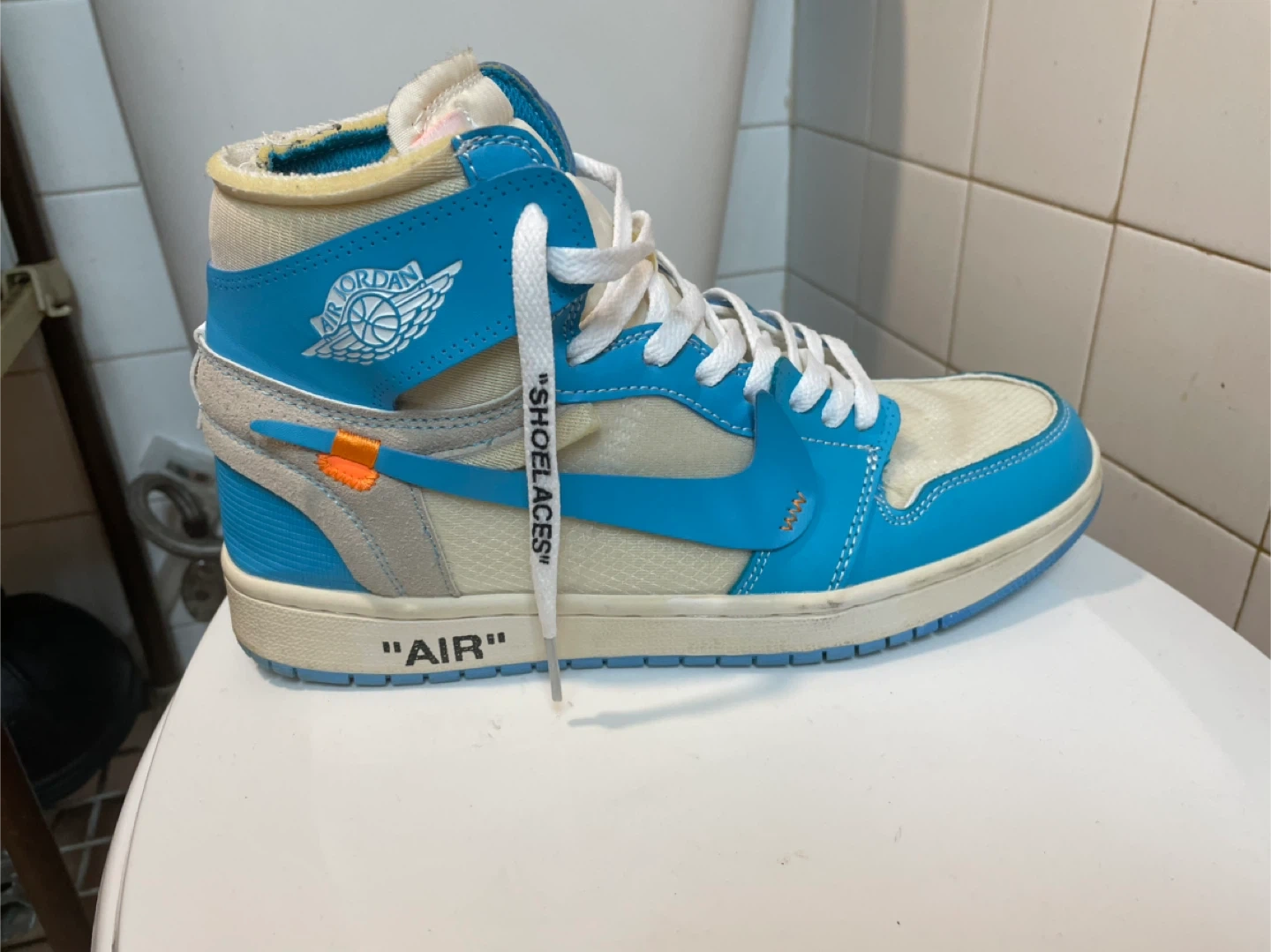 Selling a pair of Nike Air Jordan 1 x Off-White UNC sneakers. These are a stylish and unique collaboration between Nike and Off-White, featuring the iconic Air Jordan 1 silhouette with deconstructed elements and signature Off-White details. The UNC colorway adds a vibrant touch to the classic design