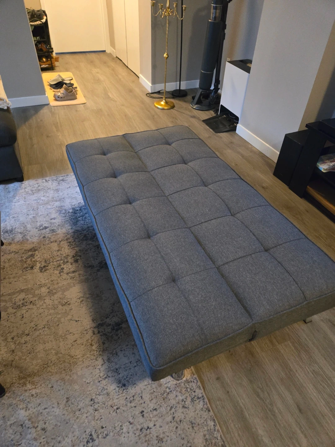 Selling a gray futon sofa bed that's in great condition! It's perfect for small spaces and can easily be converted into a bed for guests. The futon is comfortable and stylish, making it a great addition to any living room or guest room