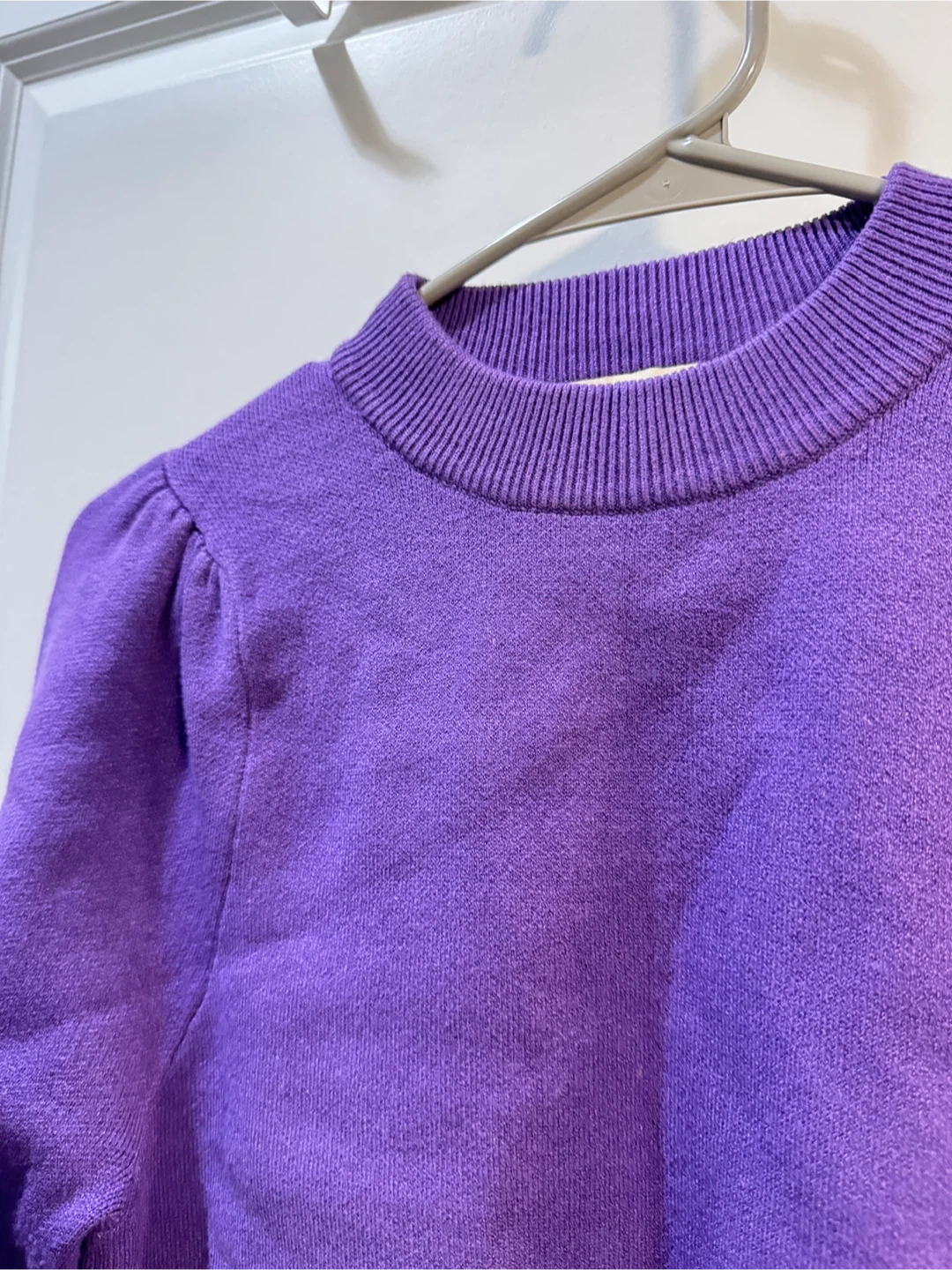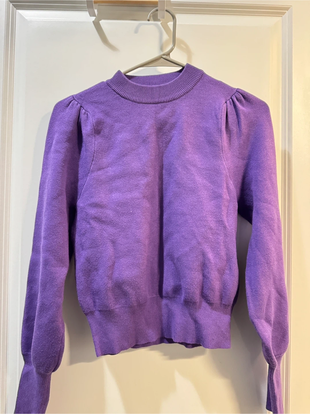 Cute purple sweater with puff sleeves! It's in great condition and ready for a new home. The color is a vibrant purple