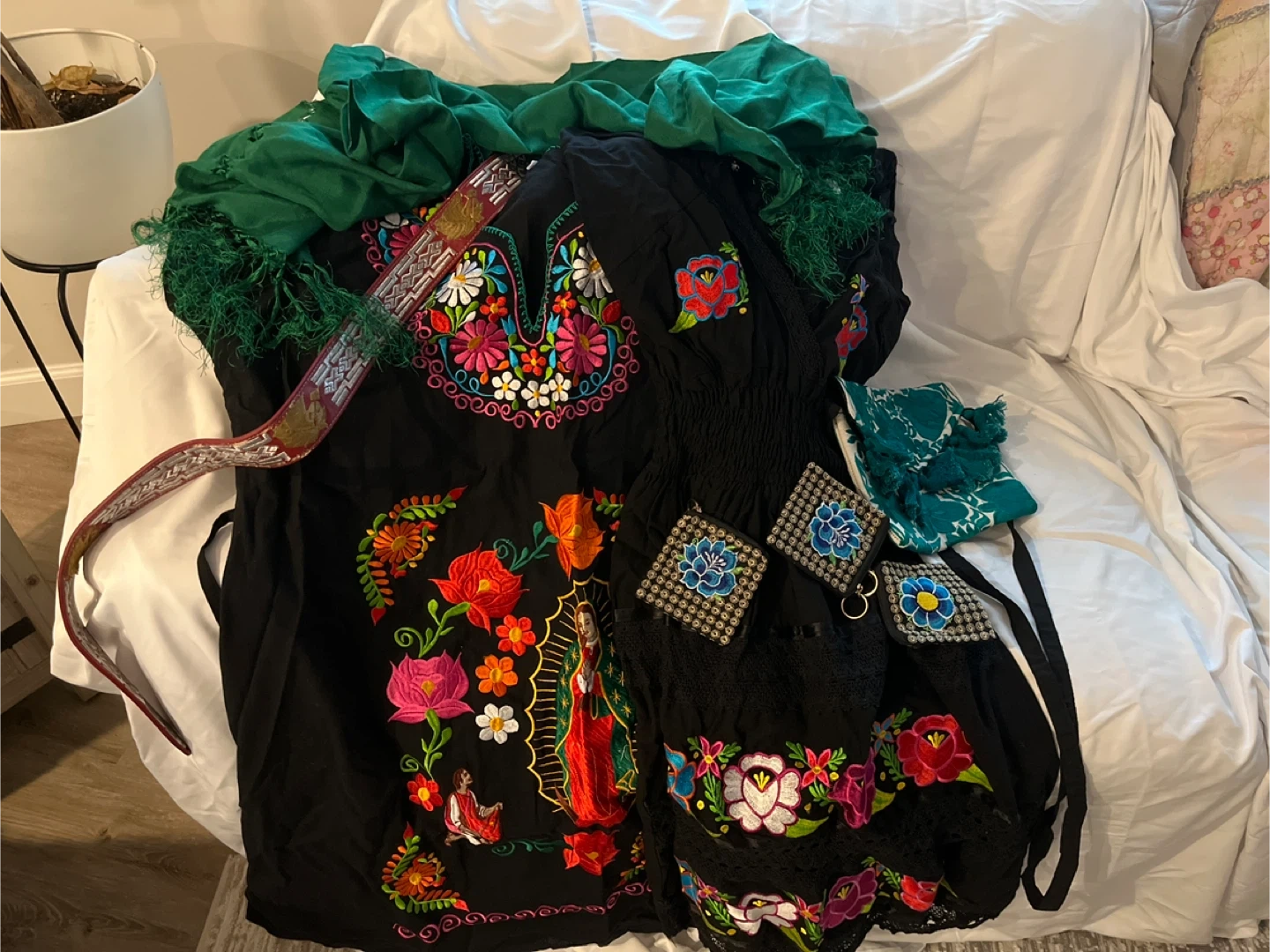 Selling a beautiful set of traditional Mexican clothing and accessories! This includes a black dress with colorful floral embroidery and an image of the Virgin Mary, a woven belt, a pair of matching earrings with blue floral details, and a green scarf. Perfect for cultural events or adding a unique touch to your wardrobe
