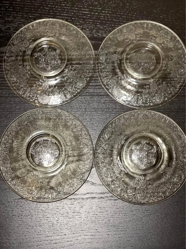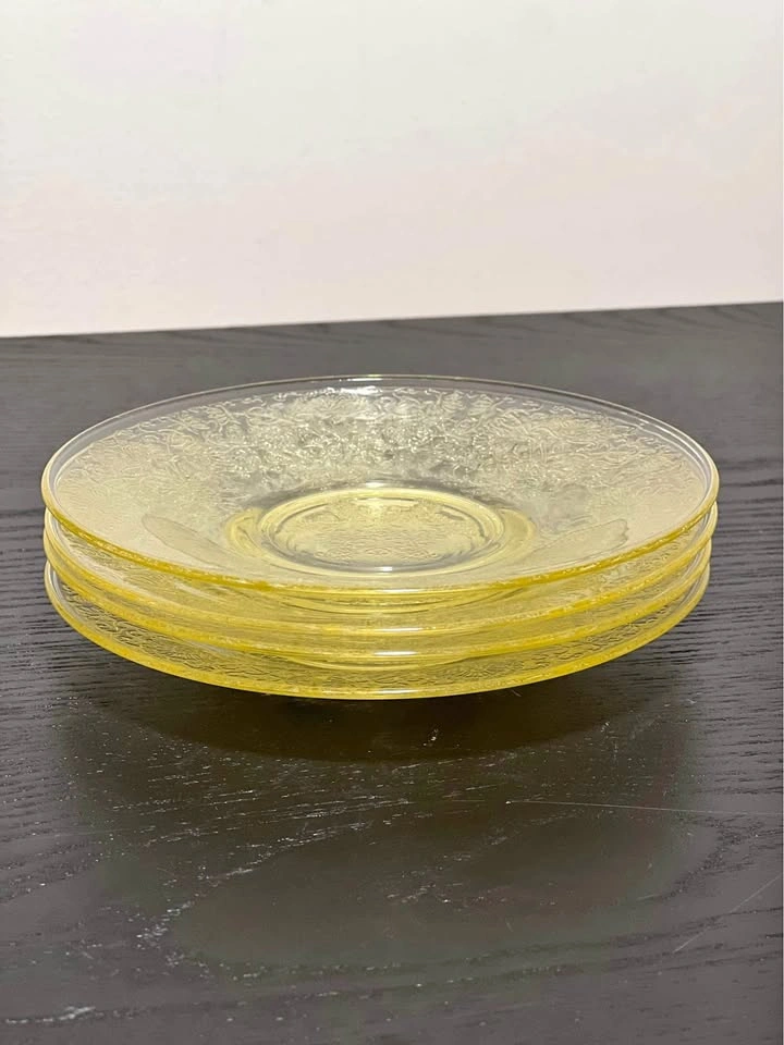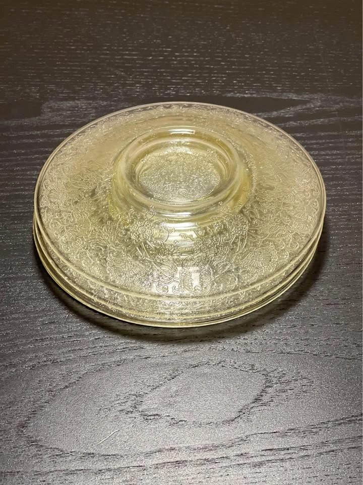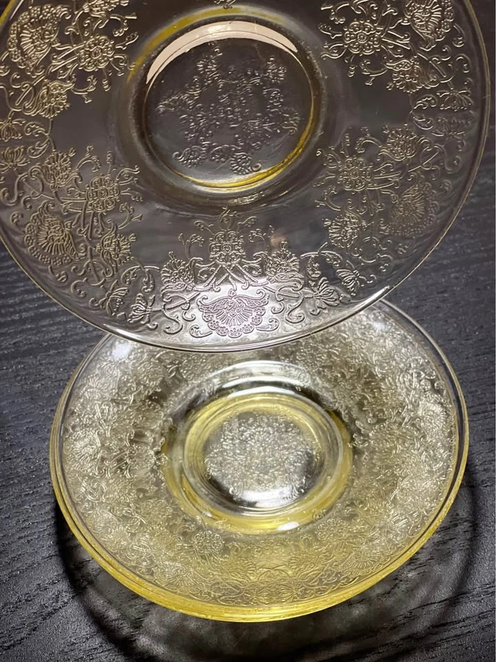 131These are Hazel-Atlas Florentine Poppy #2 yellow depression glass saucers. This glassware line was produced by the Hazel-Atlas Glass Company from approximately 1932 to 1935 and is a popular collectible item. Key Information Manufacturer: Hazel-Atlas Glass Company Pattern Name: Florentine, commonly referred to as "Poppy #2" Color: Yellow (sometimes referred to as "canary yellow" or "topaz" in depression glass terms) Era: Produced during the Great Depression, circa 1932–1935 Description: The pattern features an all-over swirling poppy motif molded into the glass. Florentine #2 pieces are typically round, distinguishing them from the more angled shapes of the Florentine #1 pattern. 5.5” Diameter Sold as is