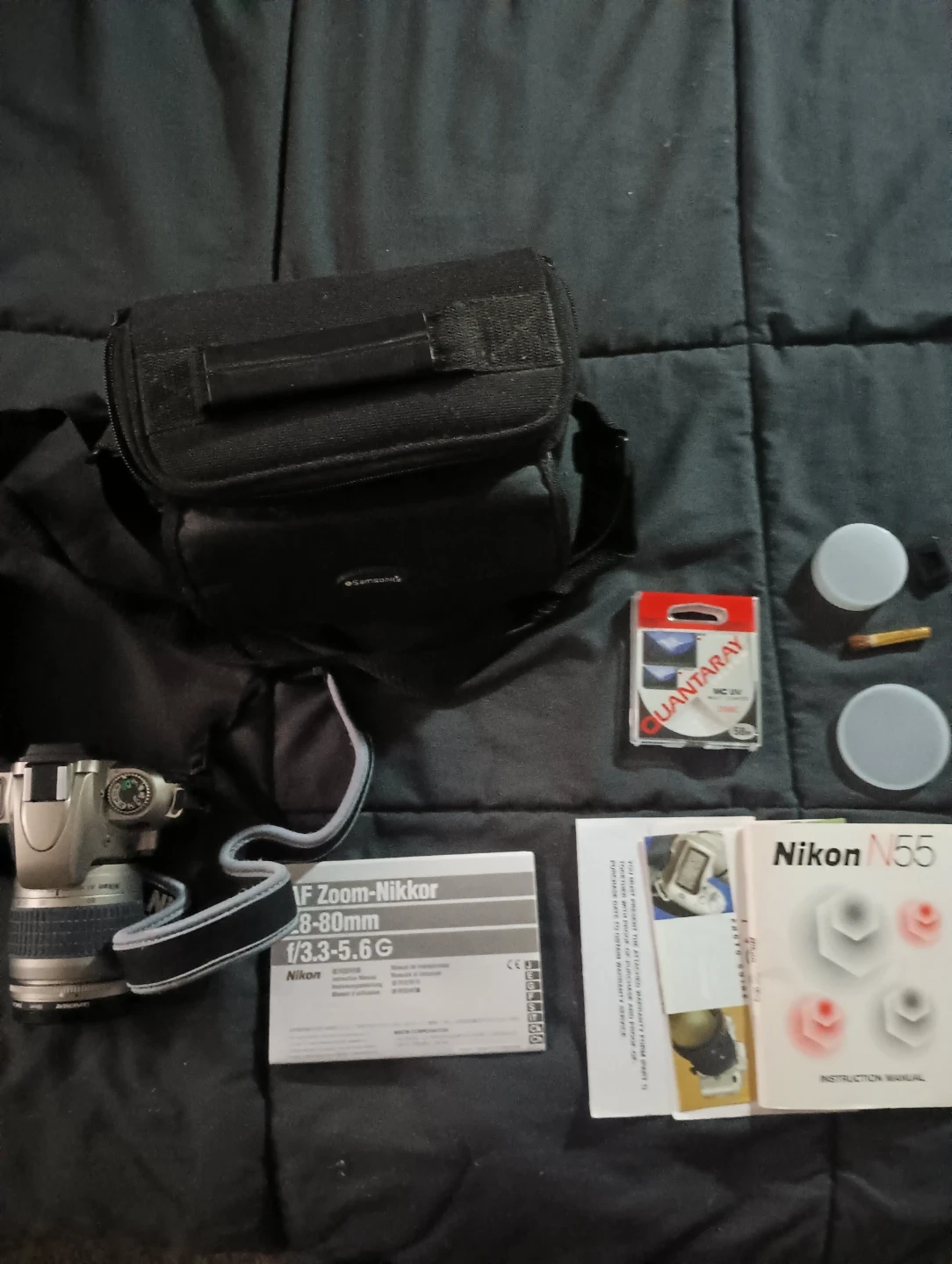 70Selling a Nikon N55 SLR camera. It comes with an IF Zoom-Nikkor 28-80mm 1:3.3-5.6G lens. Also included is a Quantaray 49mm 1A filter, lens caps, instruction manual, and a Samsonite camera bag. Great starter kit!