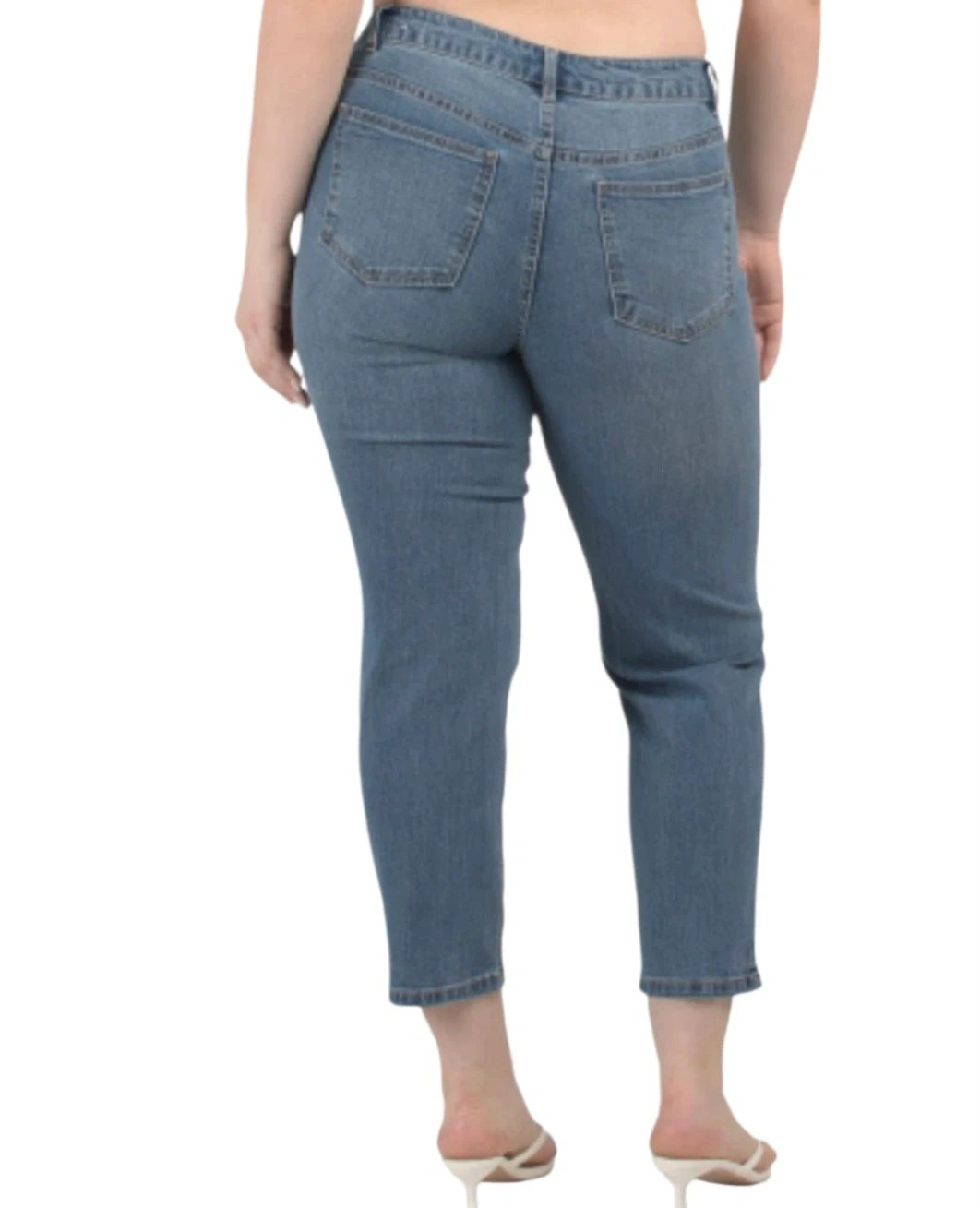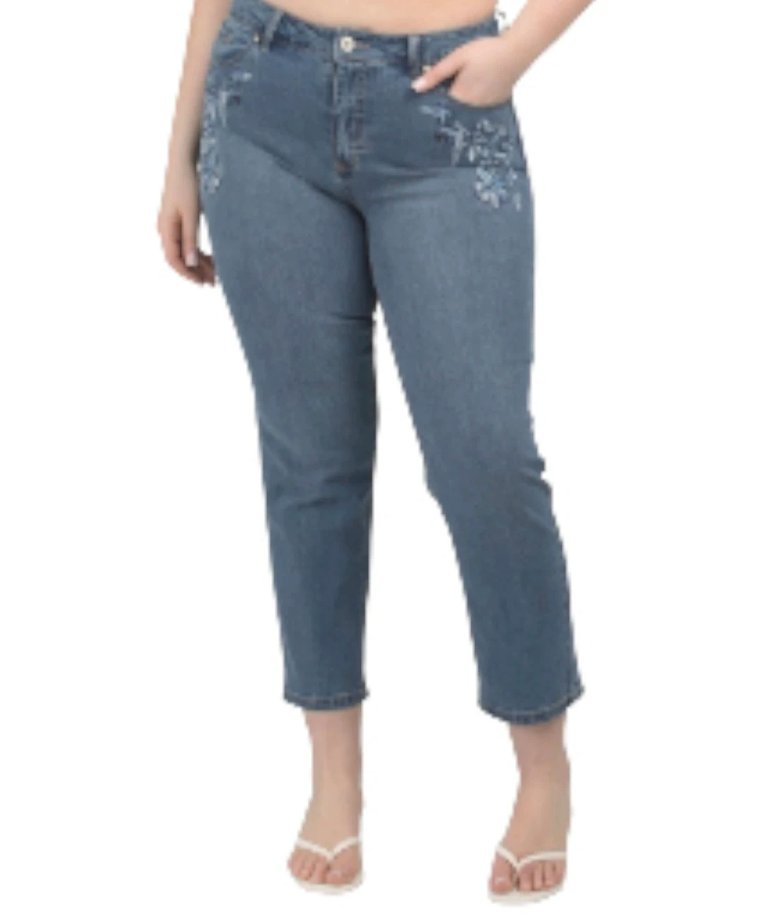 Camila Coelho high rise straight leg jeans with floral embroidered pocket detail. Made with recycled fibers for a comfortable fit with stretch. Features a flattering high waist, cropped length, and classic straight leg silhouette.