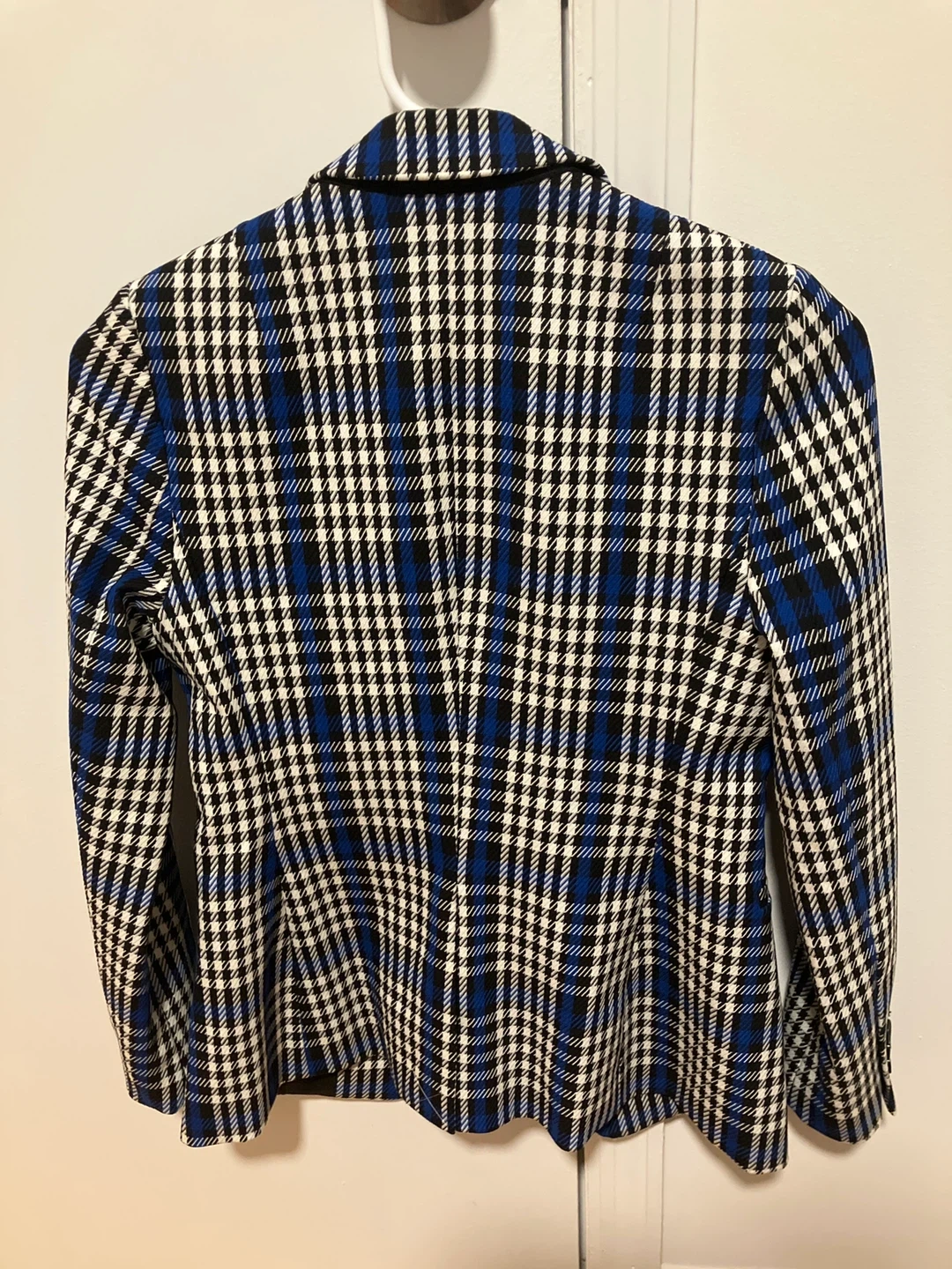 Banana Republic Long and Lean Blazer in a petite size 00P. The blazer features a black, white, and blue plaid pattern. It's in great condition and ready for a new home!