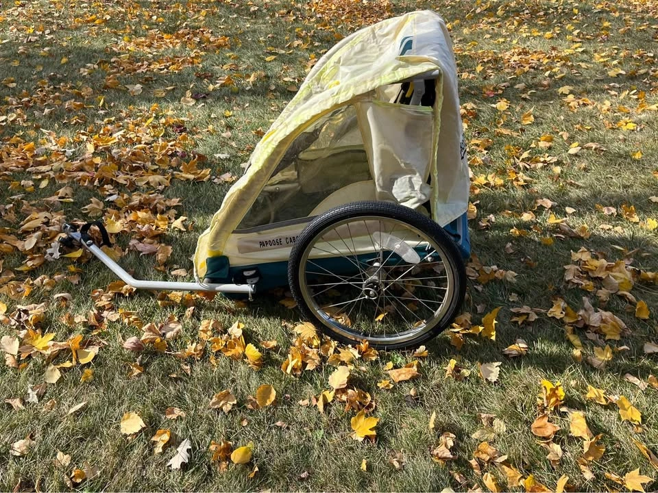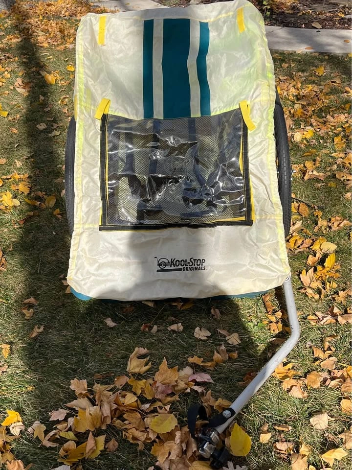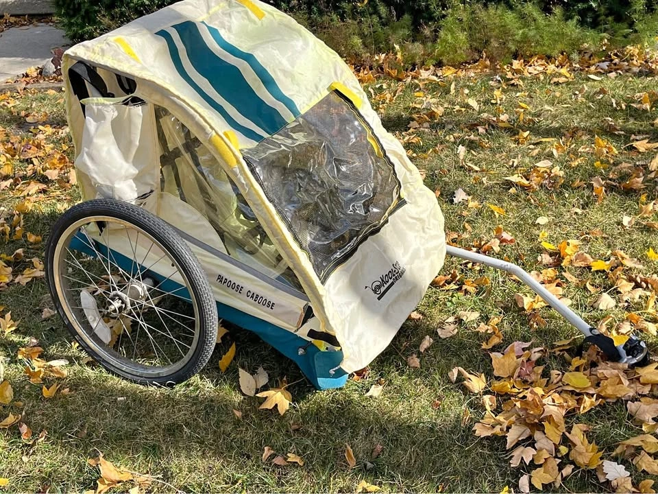 2 seater bicycle trailer. Carry little ones along on your adventures with ease. Cover intact. Buckles intact for safer travel. Tires intact. Clamp for parent bicycle works well and has intact back up buckle for added safety. Porch pick up in Yorkville.