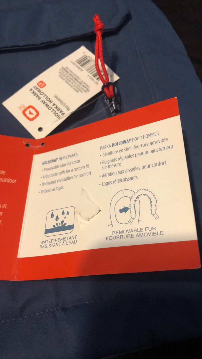 This parka features a removable faux fur collar, adjustable cuffs for a custom fit, underarm ventilation for comfort, and reflective logos. It's also water-resistant. The tag shows it originally retailed for $159.99