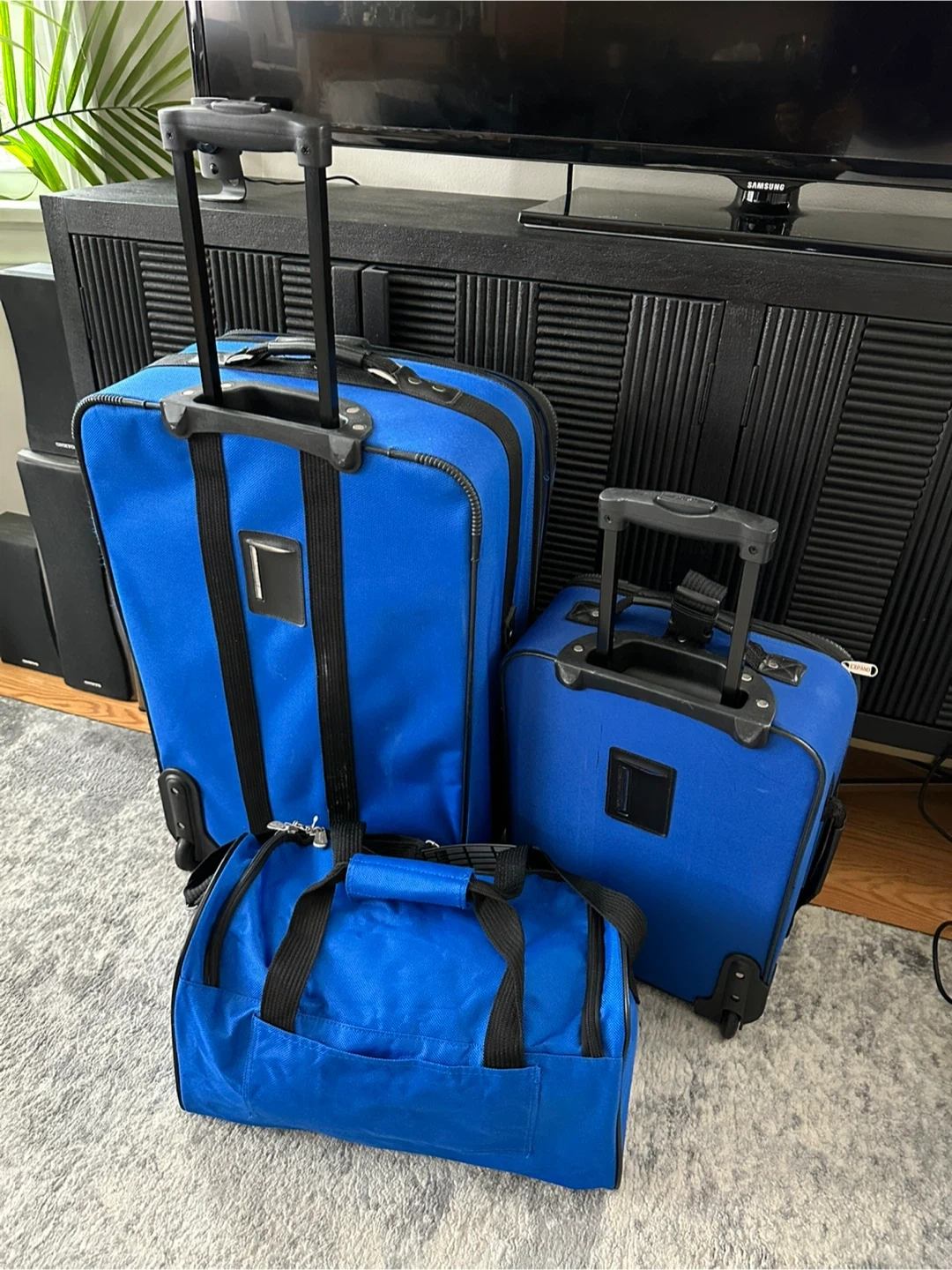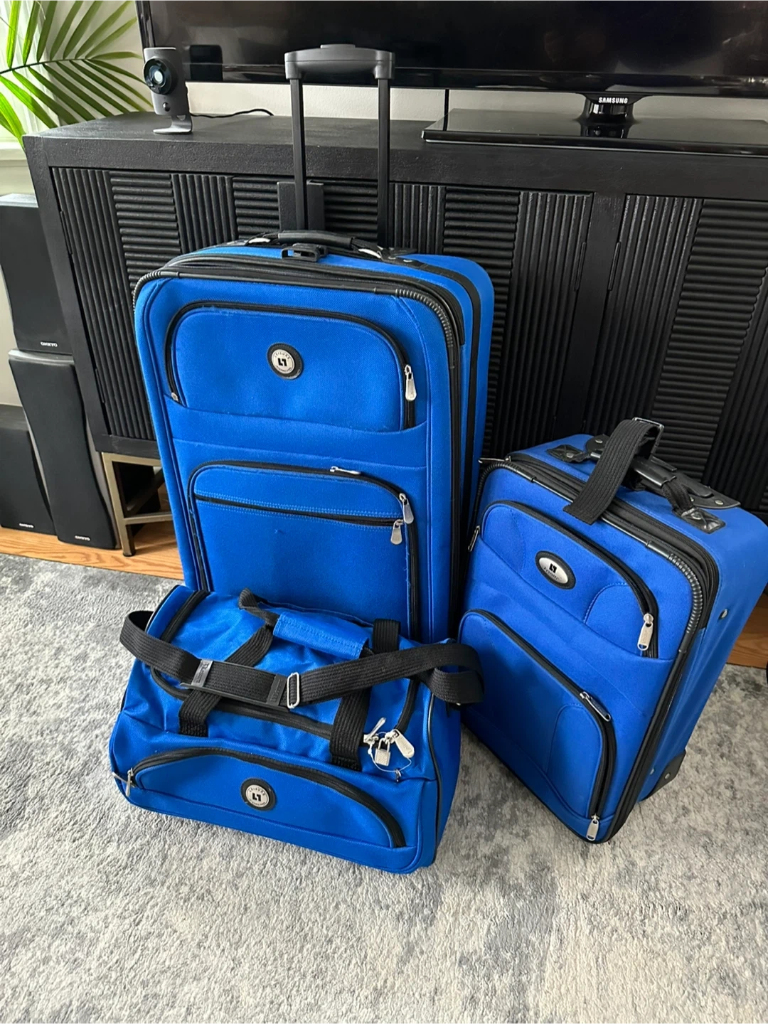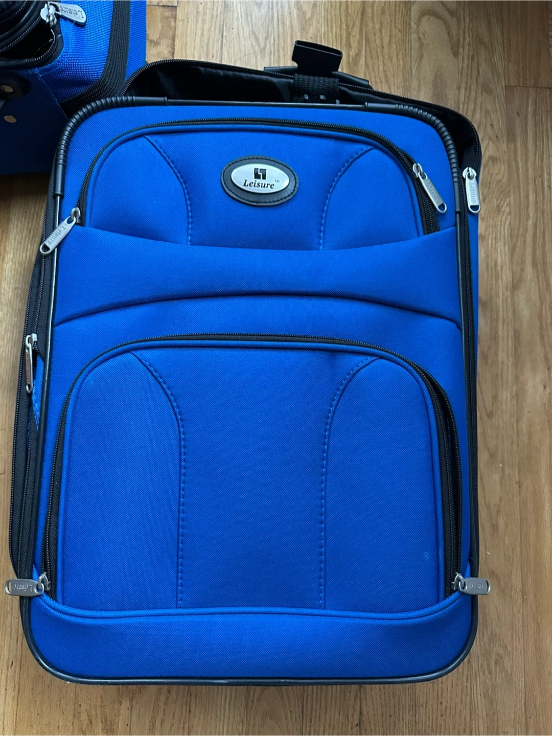 Selling a 3-piece luggage set from Leisure in a vibrant blue color! Includes a large rolling suitcase, a smaller carry-on size rolling suitcase, and a duffel bag. Perfect for all your travel needs. Two wheels . Duffel bag has never been used (has lock and key). Has some minor wear/tear