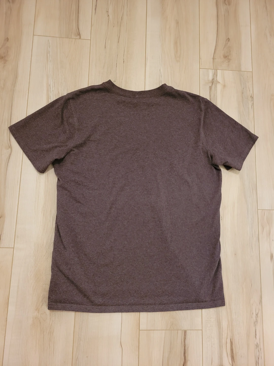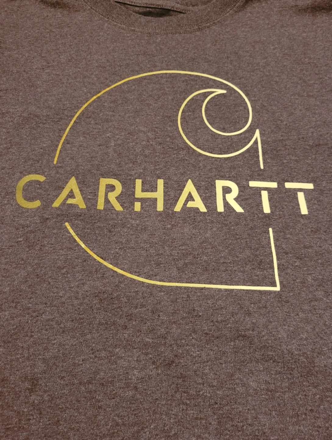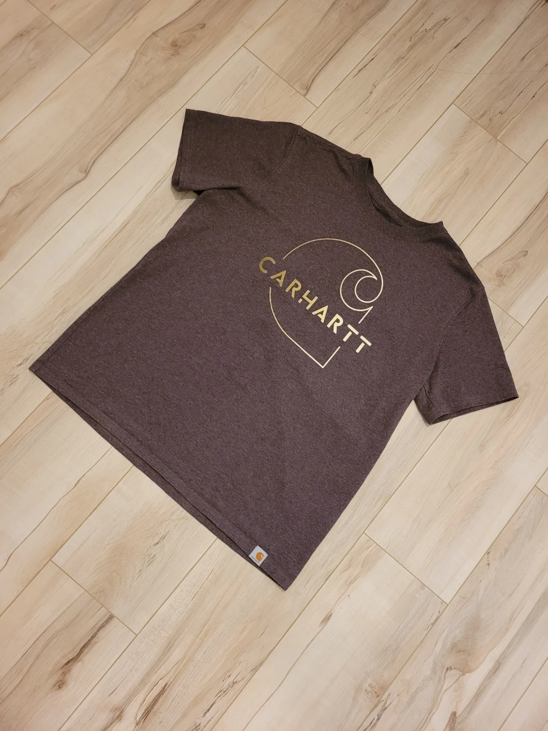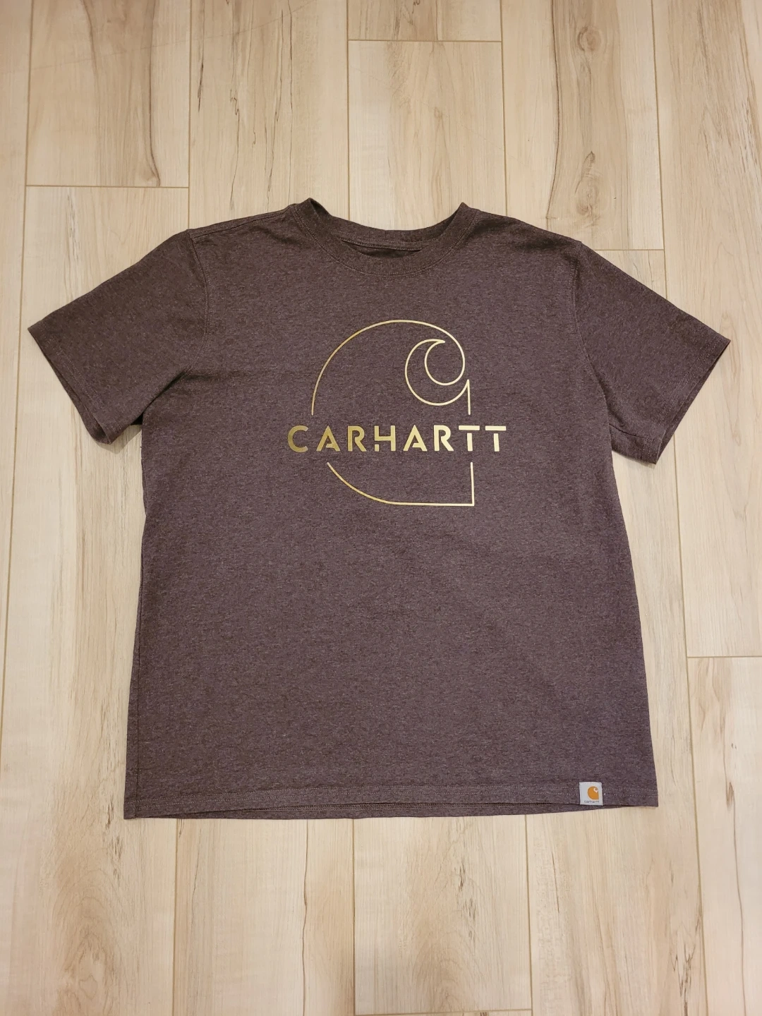 Selling a Women's Carhartt tee in size Large (12-14). It's a brown color with a gold Carhartt logo on the front. The shirt is a loose fit and made in Guatemala. The tag says "Built to serve and protect hardworking people"