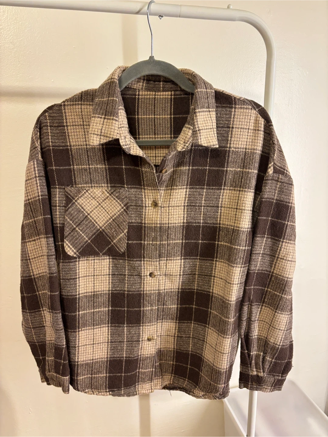 Selling a set of shirt and skirt with brown plaid pattern. They are in great condition and perfect for wearing as a set or separately. Size is XS-S.