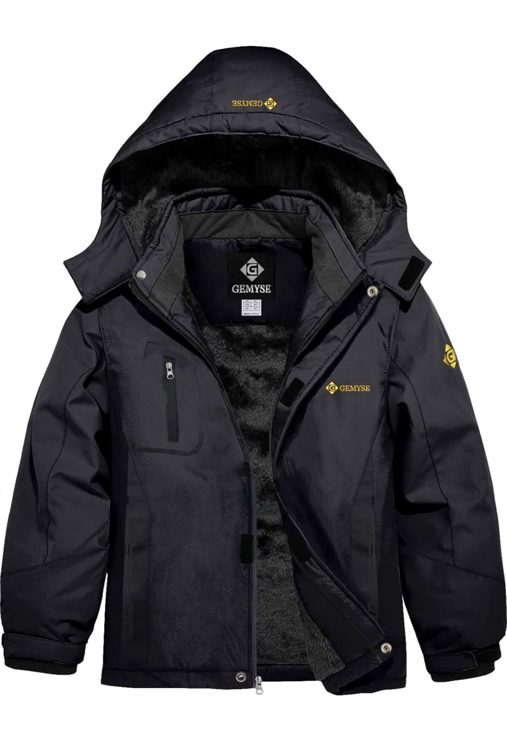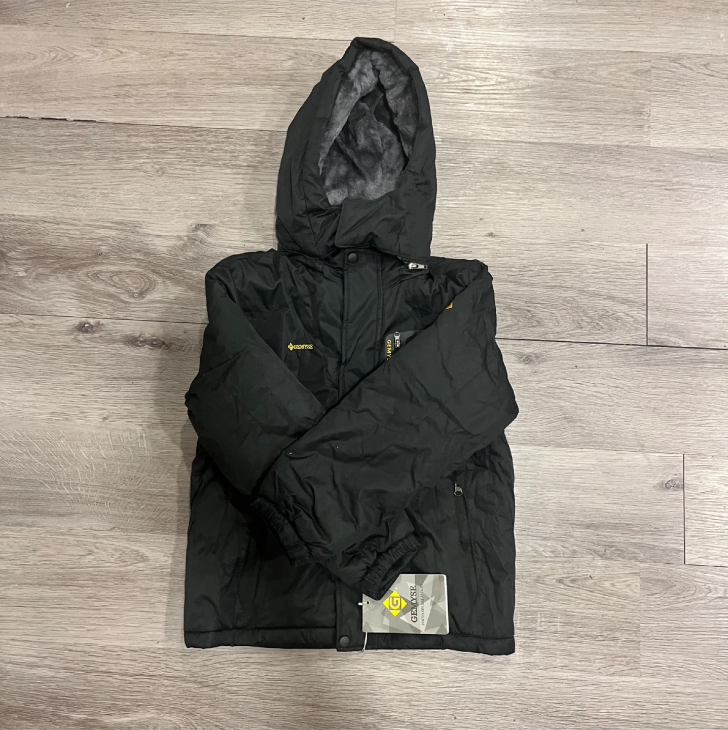 Selling a new GEMYSE winter coat for boys in size M(8). 50$ not 5$. This black coat is perfect for keeping your little one warm during the colder months. It features a hood and several pockets for convenience. The tag indicates it fits EU size M(128-134).