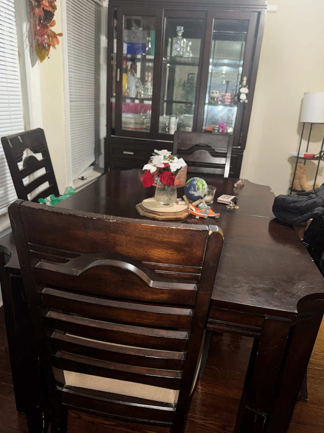 15I'm selling a dining table set. It's a beautiful, dark wood set with a classic design. The table is sturdy and spacious, perfect for family meals or gatherings. The chairs are comfortable and complement the table nicely. It has some wear and tear. 5 chairs Estoy vendiendo un juego de mesa de comedor. Es un hermoso conjunto de madera oscura con un diseño clásico. La mesa es resistente y espaciosa, perfecta para comidas familiares o reuniones. Las sillas son cómodas y complementan muy bien la mesa. Tiene algo de desgaste. 5 sillas