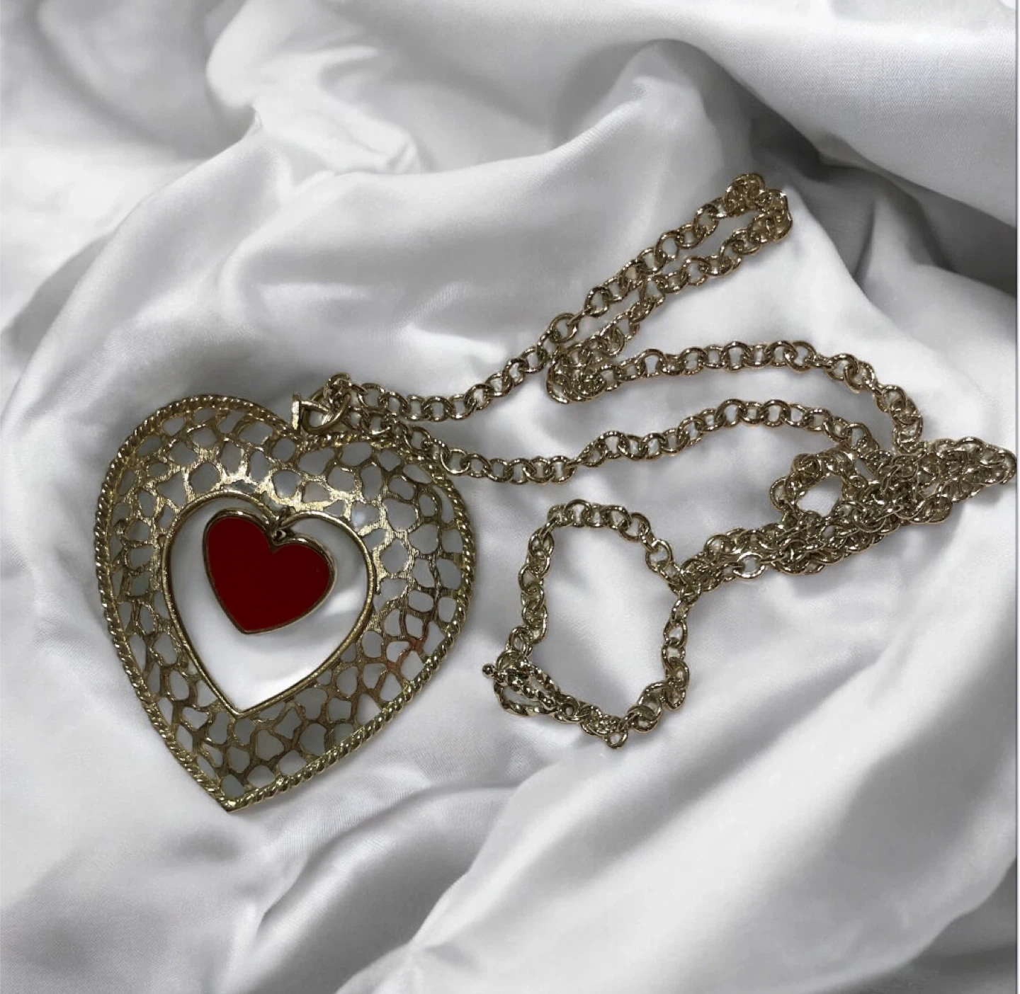SHP EXCL Large Filigree Pendant Necklace VTG with Dangling Red Heart Enamel.