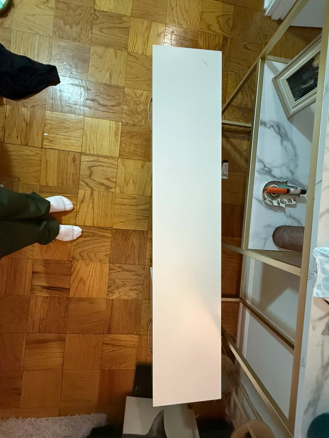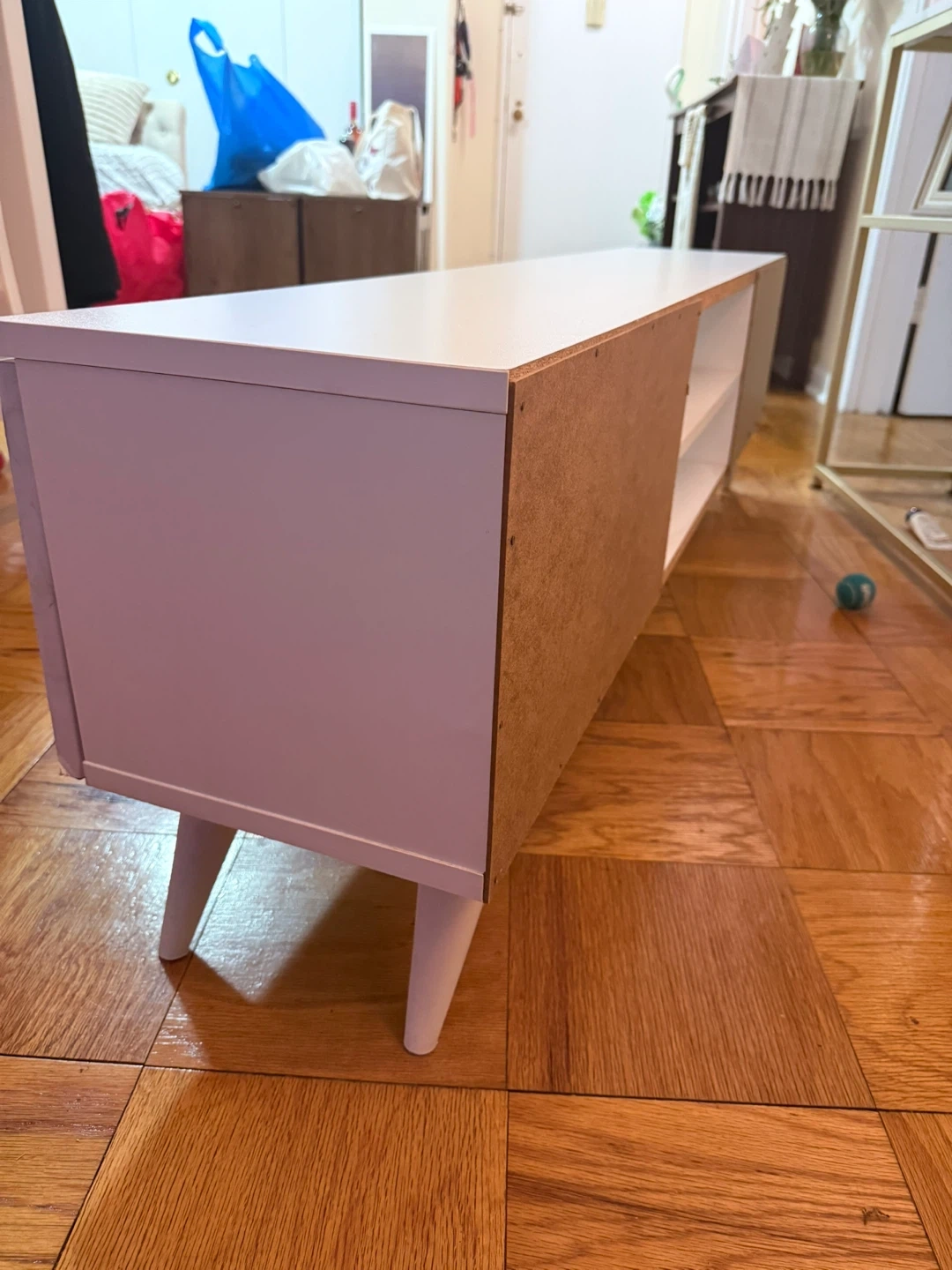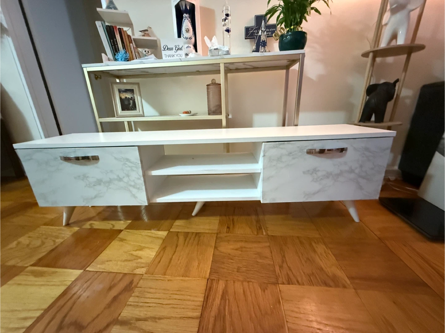 Selling a white TV stand media console. It has doors with marble-like fronts (which can be taken off for a complete white look) and open shelving in the middle. Great for storing your media devices and accessories! Very sturdy! Lasted 6 years before I upgraded!